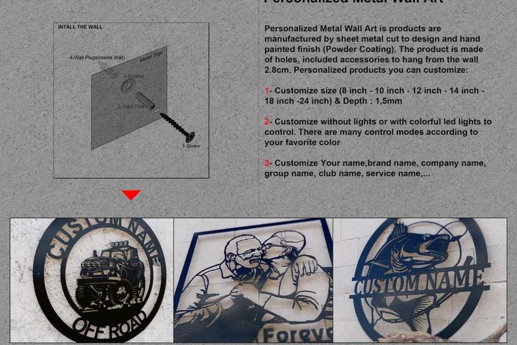 *Personalized LED Light Metal Sign is products are manufactured by sheet metal (Depth : 1,5mm) cut to design and hand painted finish.The product is made of holes, incl accessories to hang from the wall 2.8cm.Personalized products you can customize: