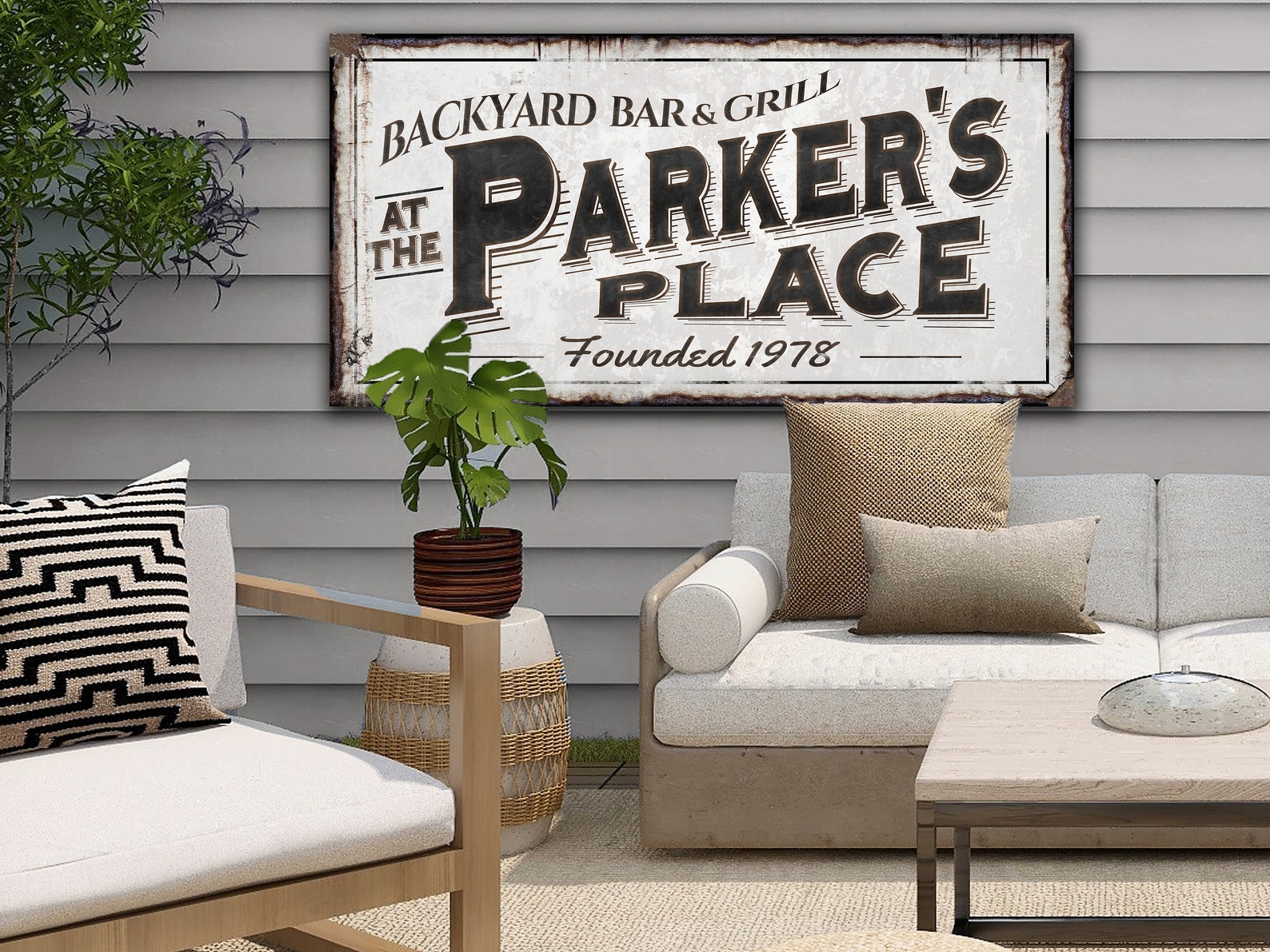 Uniquely Personalized Art for Indoor or Outdoor Display! Hang this retro, primitive farmhouse, backyard bar & grill sign anywhere inside or outside your home. Your choice of canvas or metal makes this the perfect fit for your country porch, kitchen or living room. It makes a great gift for dad or the perfect anniversary or wedding gift!