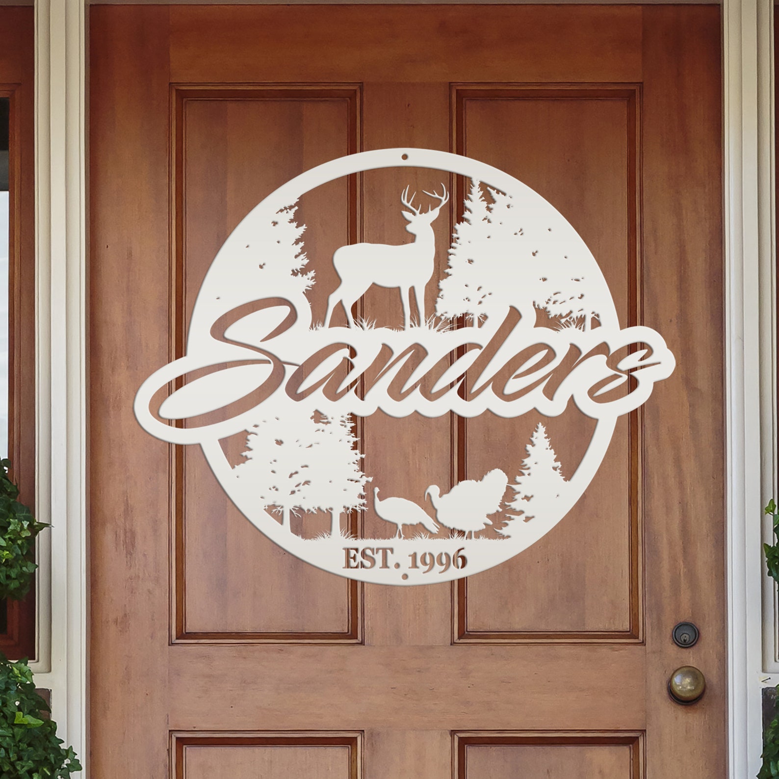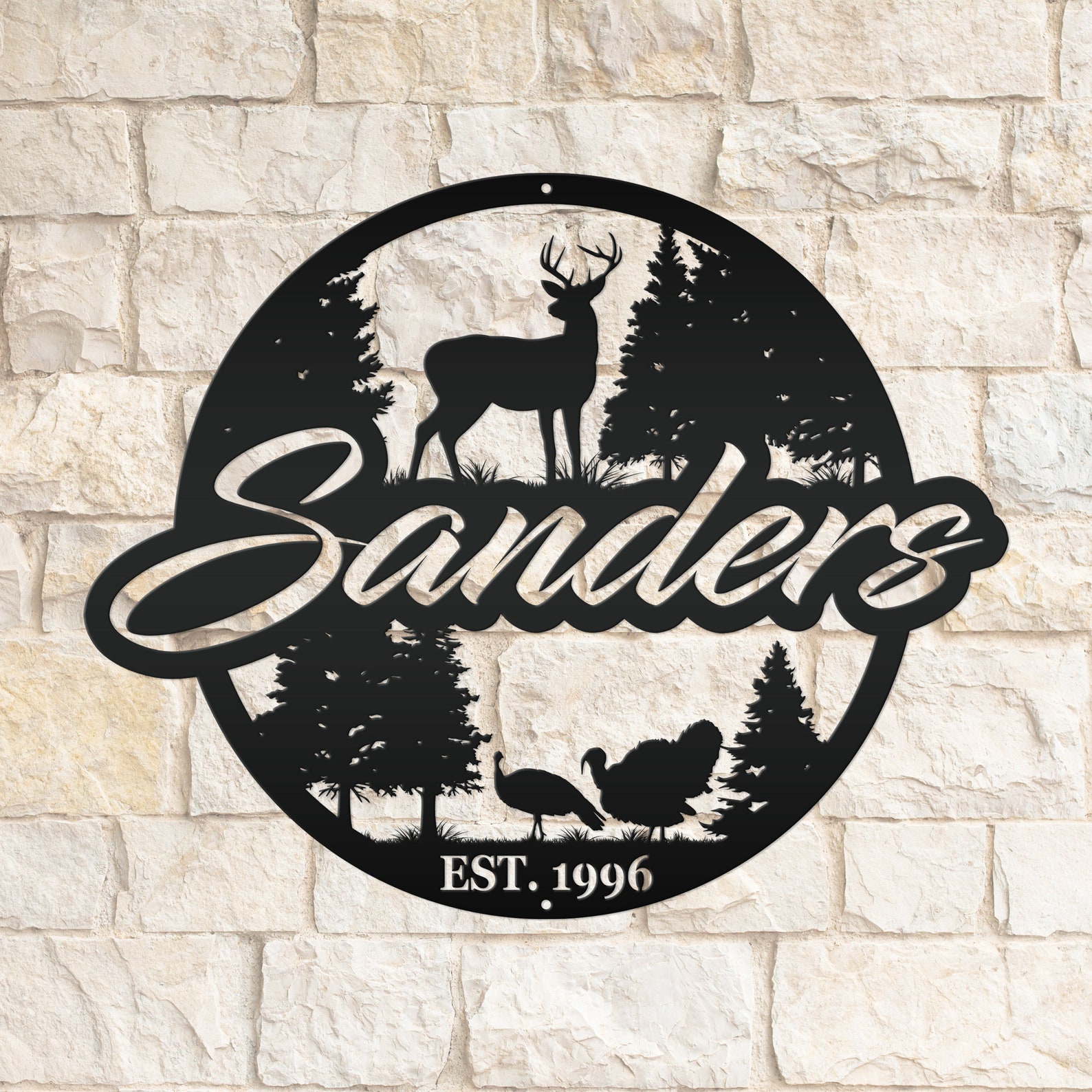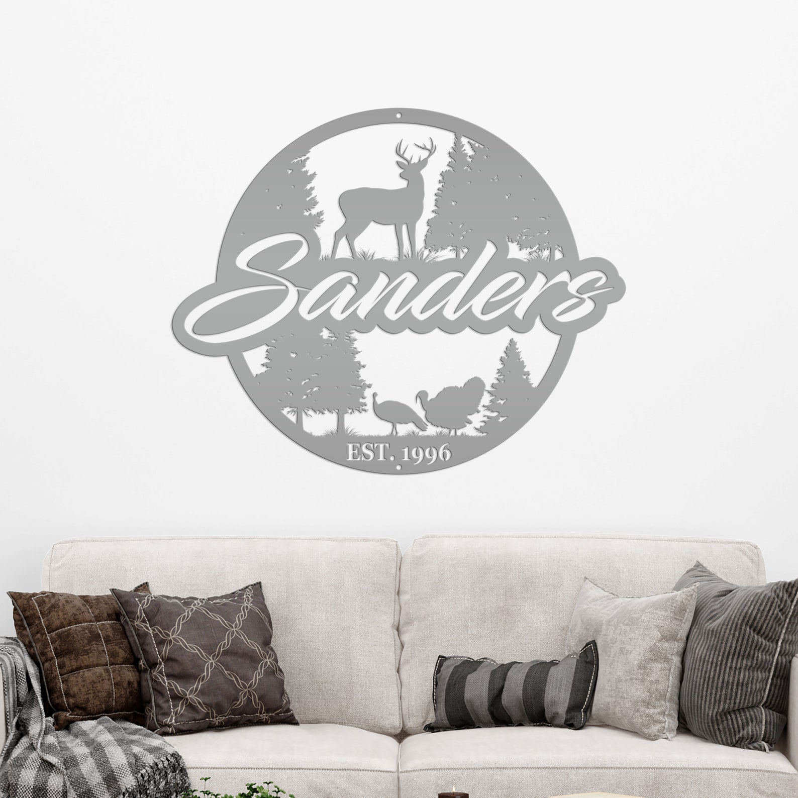 You will love the detail of our Metal Personalized Family Name Sign with Deer and Turkey Outdoor Scene. This sign would be a great addition to add home, cabin, or lodge. Makes a great gift for the hunter in your life!