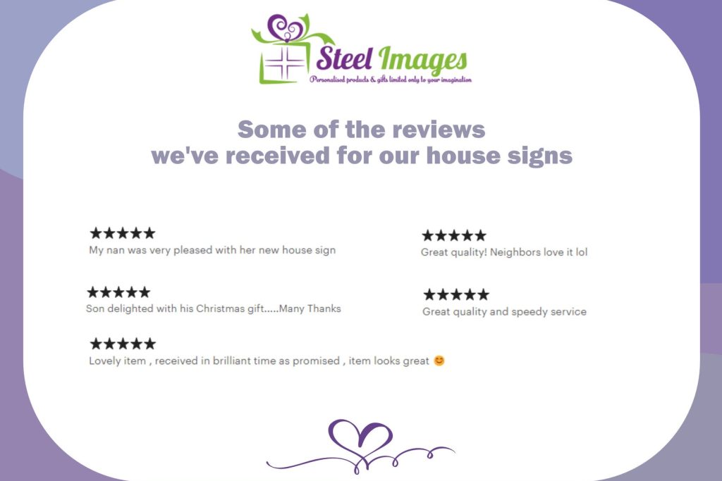 A British made, high quality house plaque, featuring a unique design. Premium quality, durable and suitable for inside or outside this powder coated sign is the perfect way to clearly identify your house name, number, or both. Regular Size, suitable for numbers (250mm x 200mm x 2mm) Large Size, suitable for names and numbers (450mm x 400mm x 2mm) – 2mm Mild Steel – Powder Coated – Comes in black as standard – White vinyl lettering applied as standard – Please specify what you would like writing on your sign when ordering (Name, number or both)