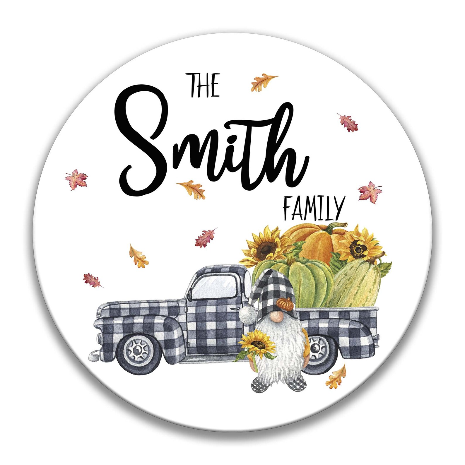 Personalized Gnome Sign, Buffalo Plaid Truck Gnome Fall Metal Sign, Round Gnome Signs, Autumn Pumpkin Patch Fall Gnome Decor Custom 7-FAL009