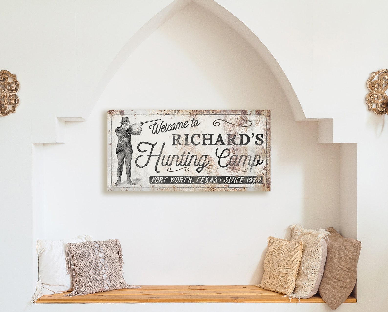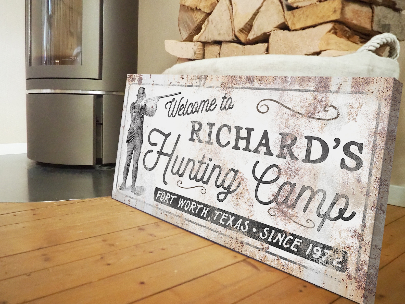 The rustic and weathered textures you see in the artwork will look the same no matter what item you order on. That means metal, wood, and canvas all have the vintage look to them!