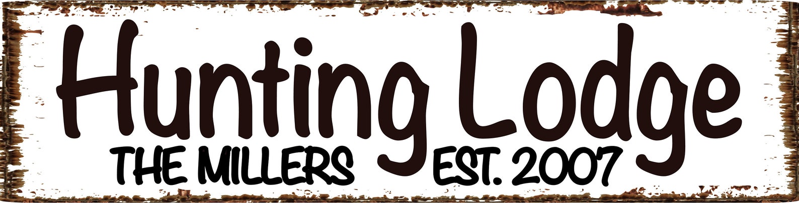 PERSONALIZED Hunting Lodge with 3 backgrounds – Barn wood, Grey & White Rusty- wood style backgrounds – Metal Sign Door Plaque – (Note not actual wood or rust so smooth and safe to the touch)
