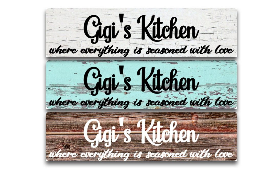 Design: Kitchen where everything is seasoned with love sign. Personalize your name. Choose from White Crackle or Grey wood Metal Sign Door Plaque – (Note not actual paint or wood so smooth)