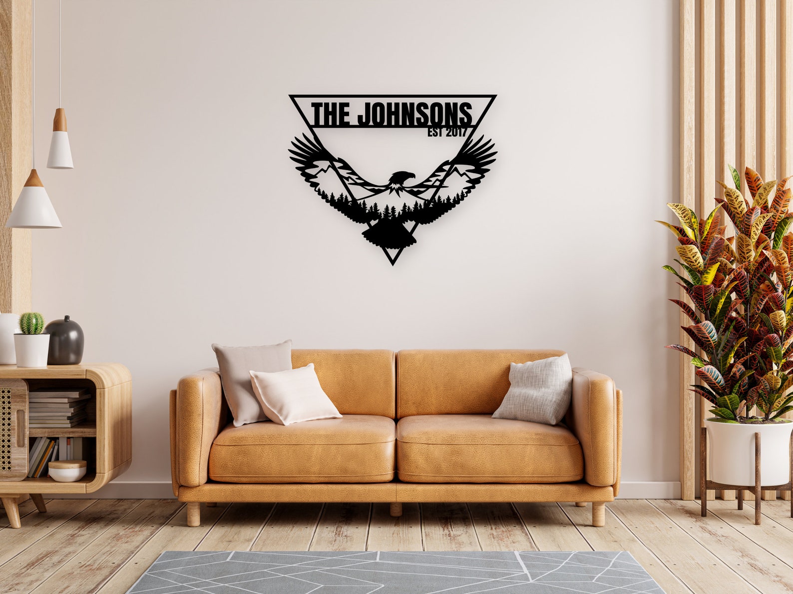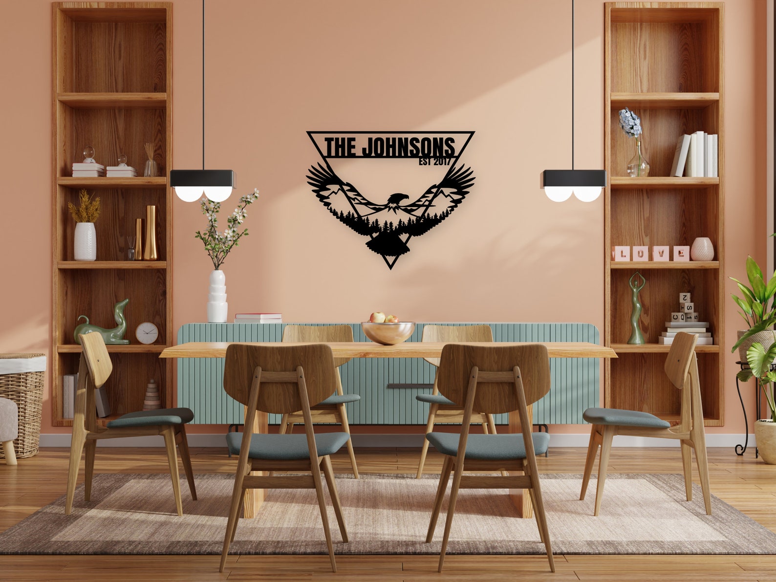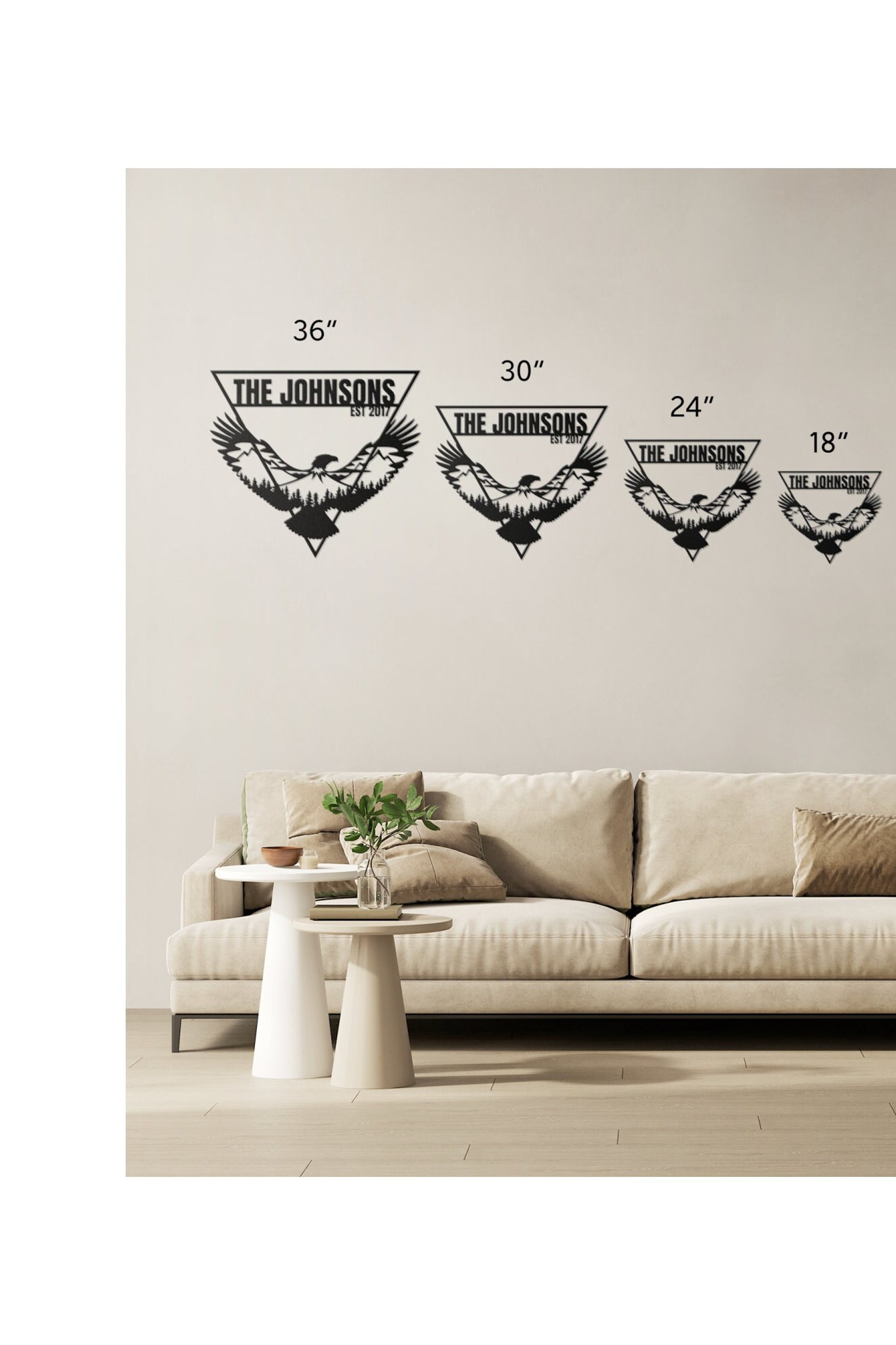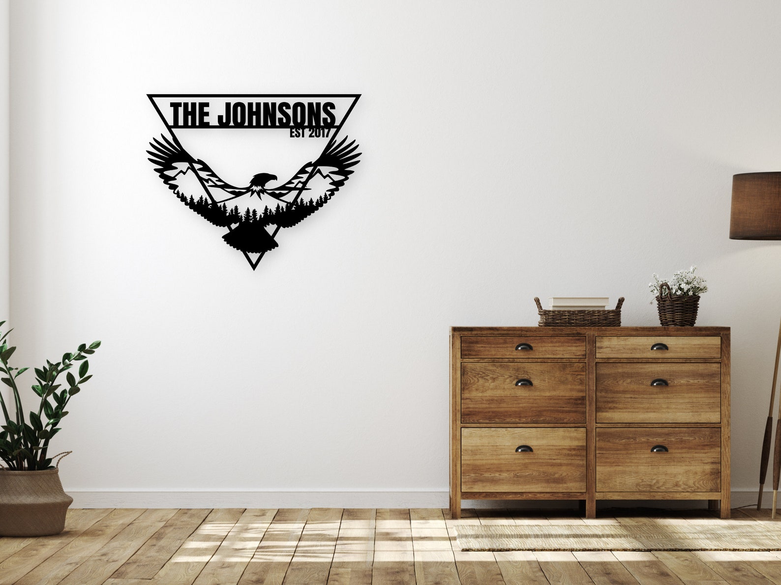 The eagle is encased within a triangle border, creating a beautiful and modern design that will complement any home decor style. Additionally, you have the option to personalize this metal eagle wall art with custom text, making it the perfect family name sign or personalized sign for your home.