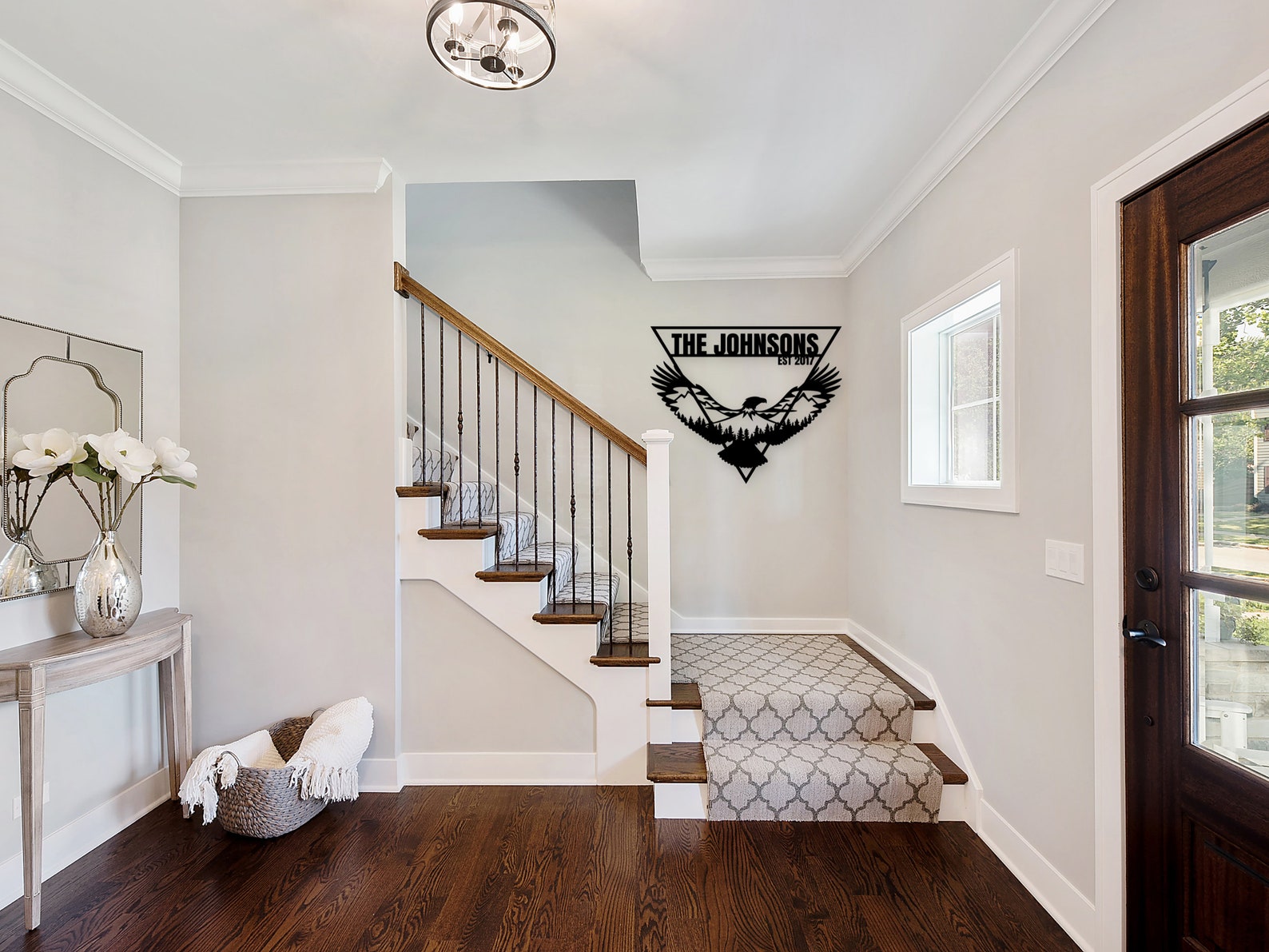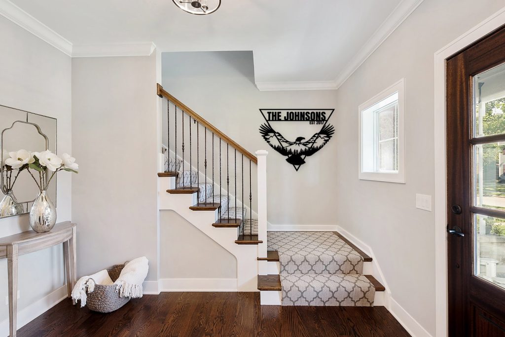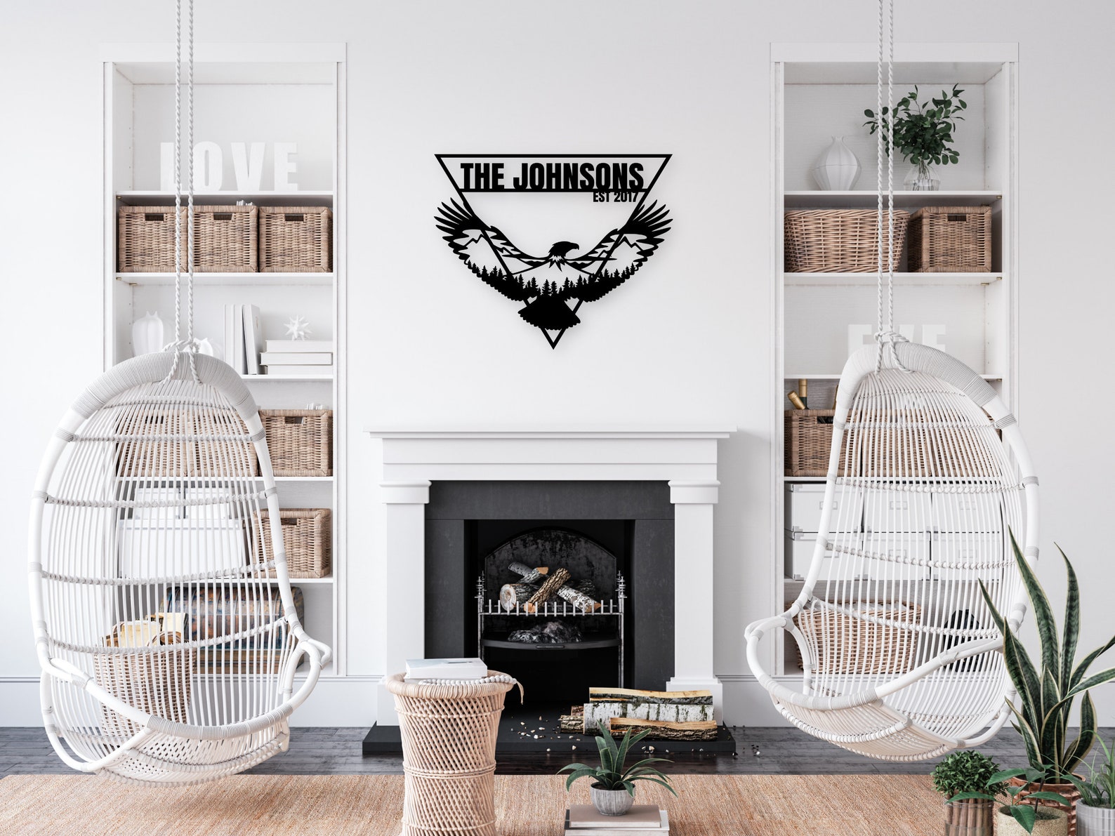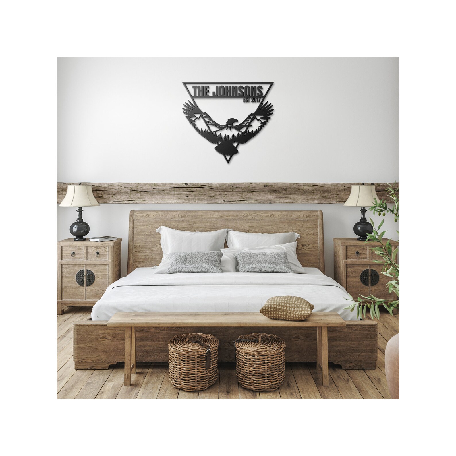 The eagle is encased within a triangle border, creating a beautiful and modern design that will complement any home decor style. Additionally, you have the option to personalize this metal eagle wall art with custom text, making it the perfect family name sign or personalized sign for your home.
