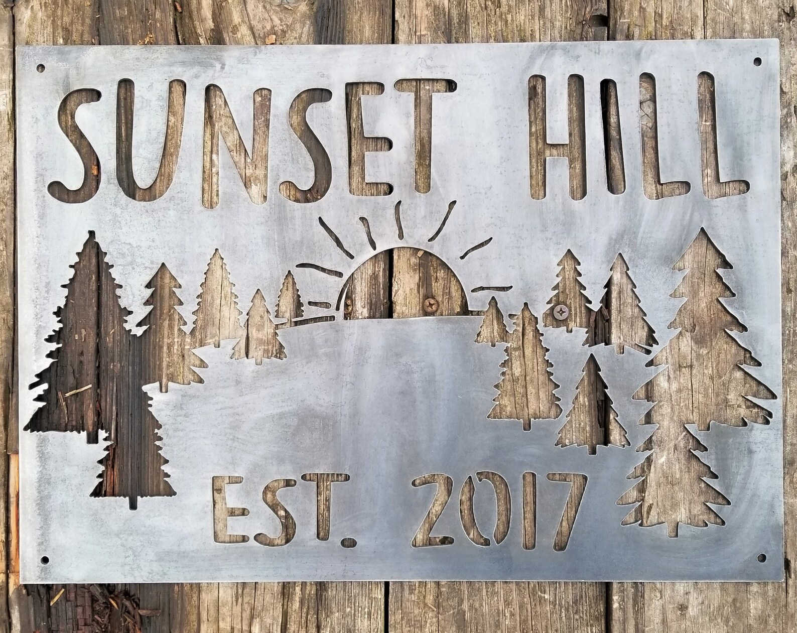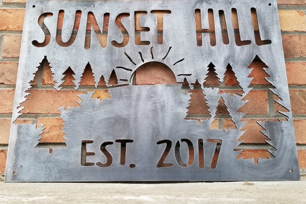Put this mountain sunset metal sign wherever you love watching the sun go behind the horizon or peaking out behind the trees the next day.