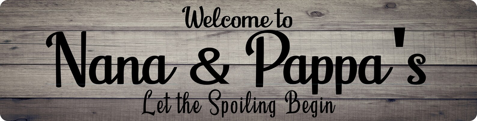 PERSONALIZE Welcome to Grandma n Grandpa9;s let the spoiling begin – choose background – Barn wood, Grey & White Crackle- wood style backgrounds – Metal Sign Door Plaque – (Note not actual wood so smooth and safe to the touch)