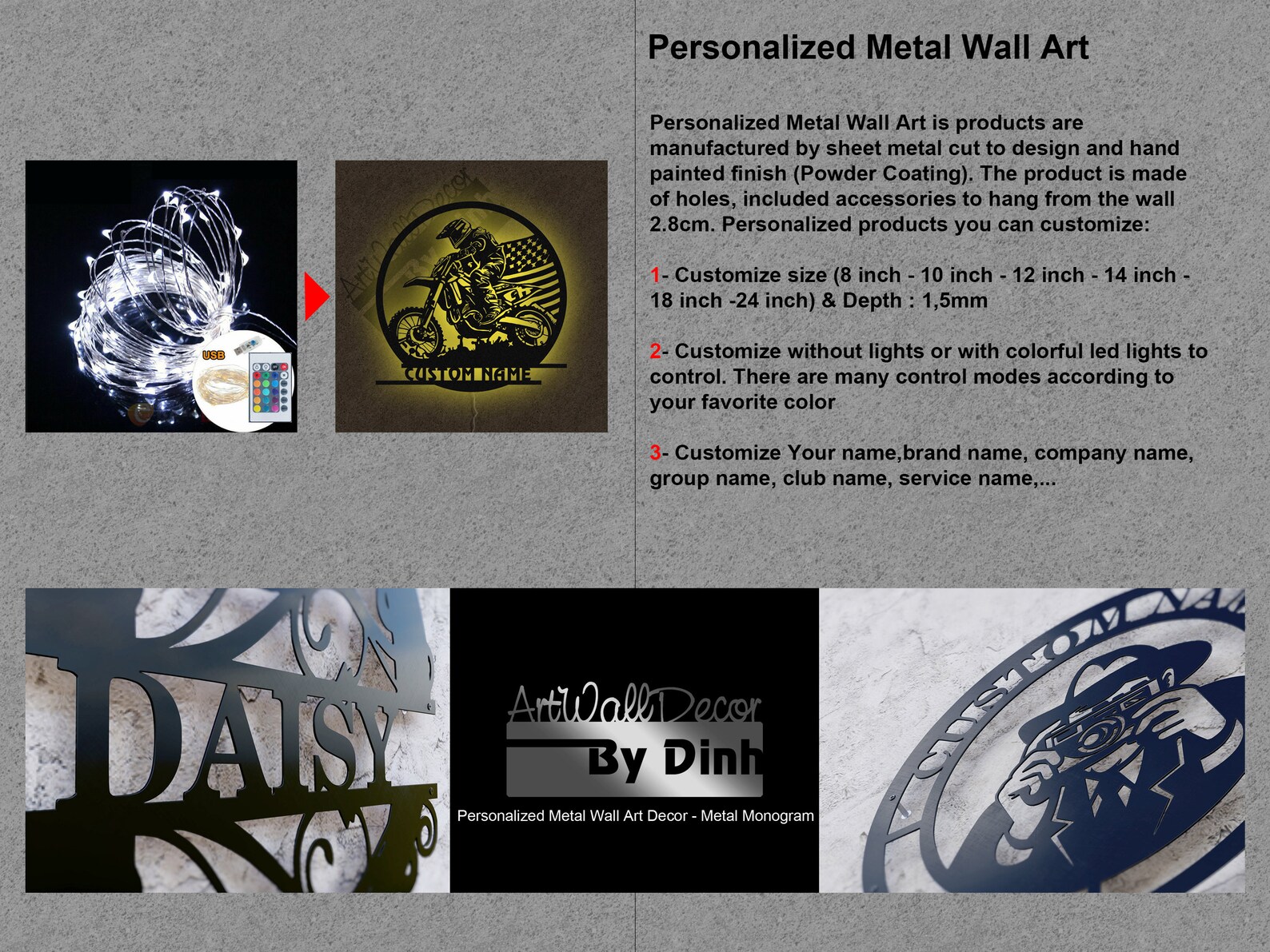 *Personalized LED Light Metal Sign is products are manufactured by sheet metal (Depth : 1,5mm) cut to design and hand painted finish.The product is made of holes, incl accessories to hang from the wall 2.8cm.Personalized products you can customize: