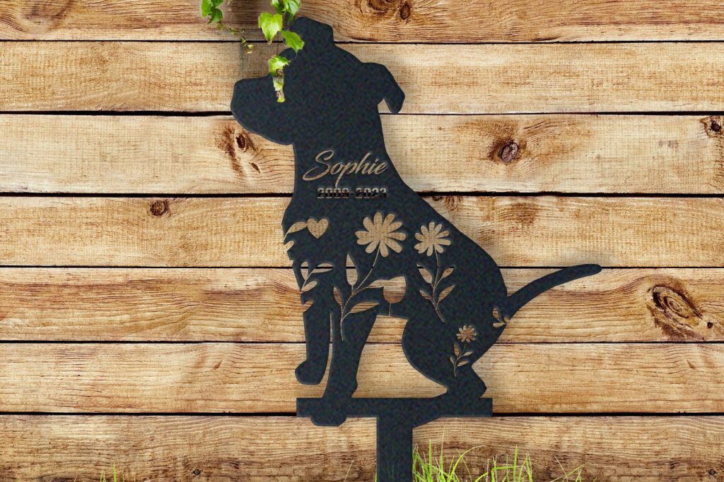 The stake features a unique design with Pit Bull silhouette, a name of your choosing, and date for you to add a special memento. It is made from a sturdy steel with powder coated.