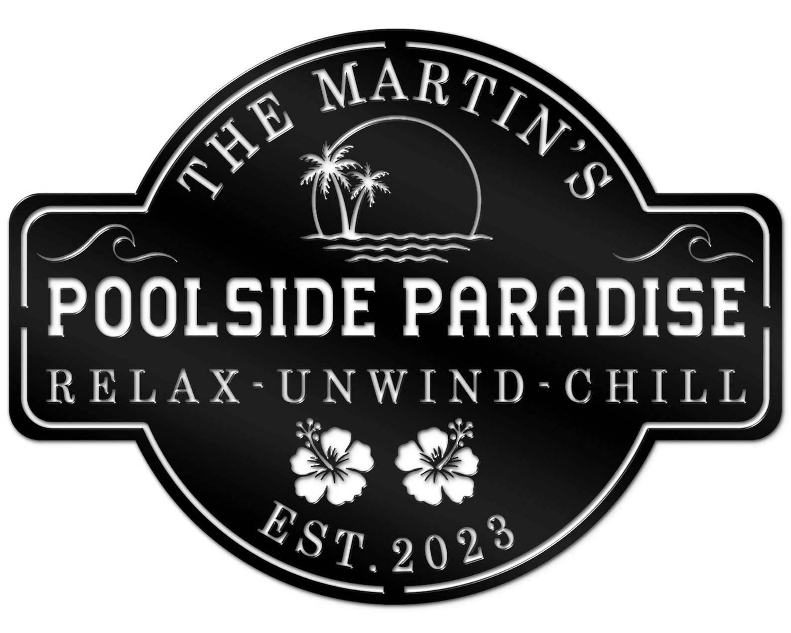 Personalized Poolside Paradise Metal Sign – Hibiscus, Aloha, Palm Tree Decor