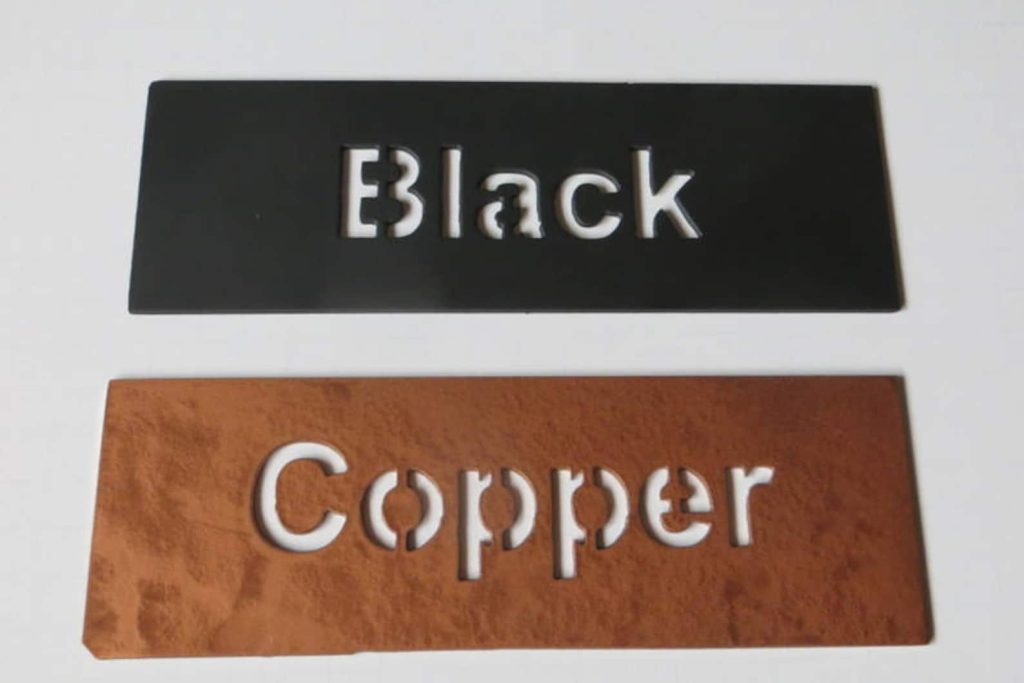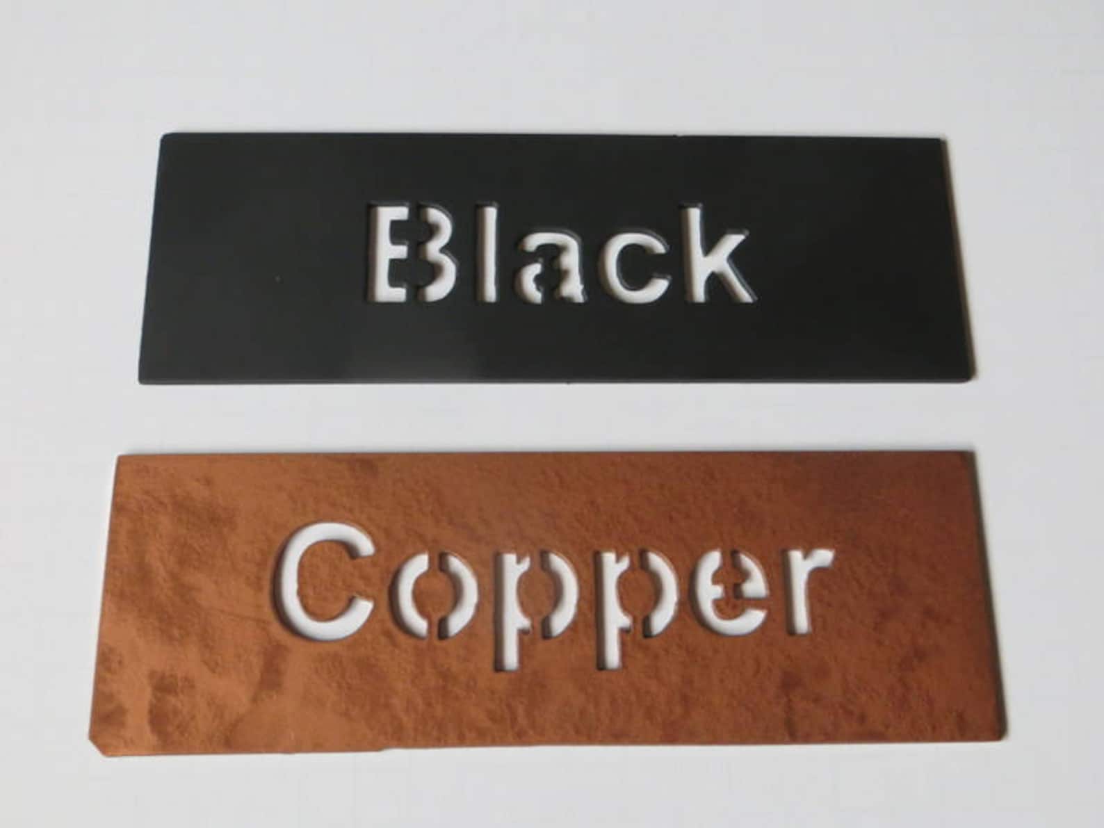 The piece is painted flat black or copper and comes finished with holes and nails for hanging.