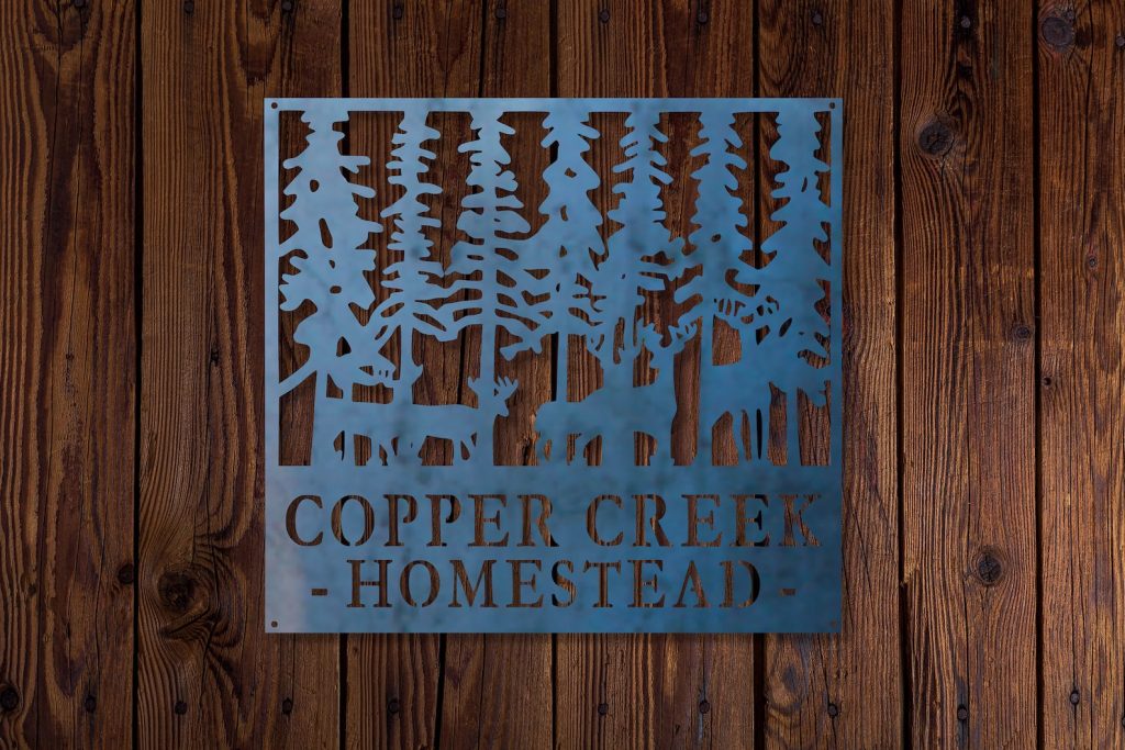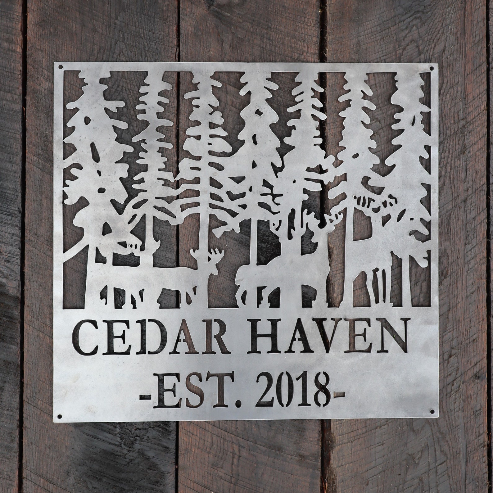 This personalized metal established sign will help remind you why you love the beauty of the wilderness and the mystery of the forest. The forest imagery with deer walking softly through the trees has a sophisticated look with a rustic feel that will add character and charm to any home.