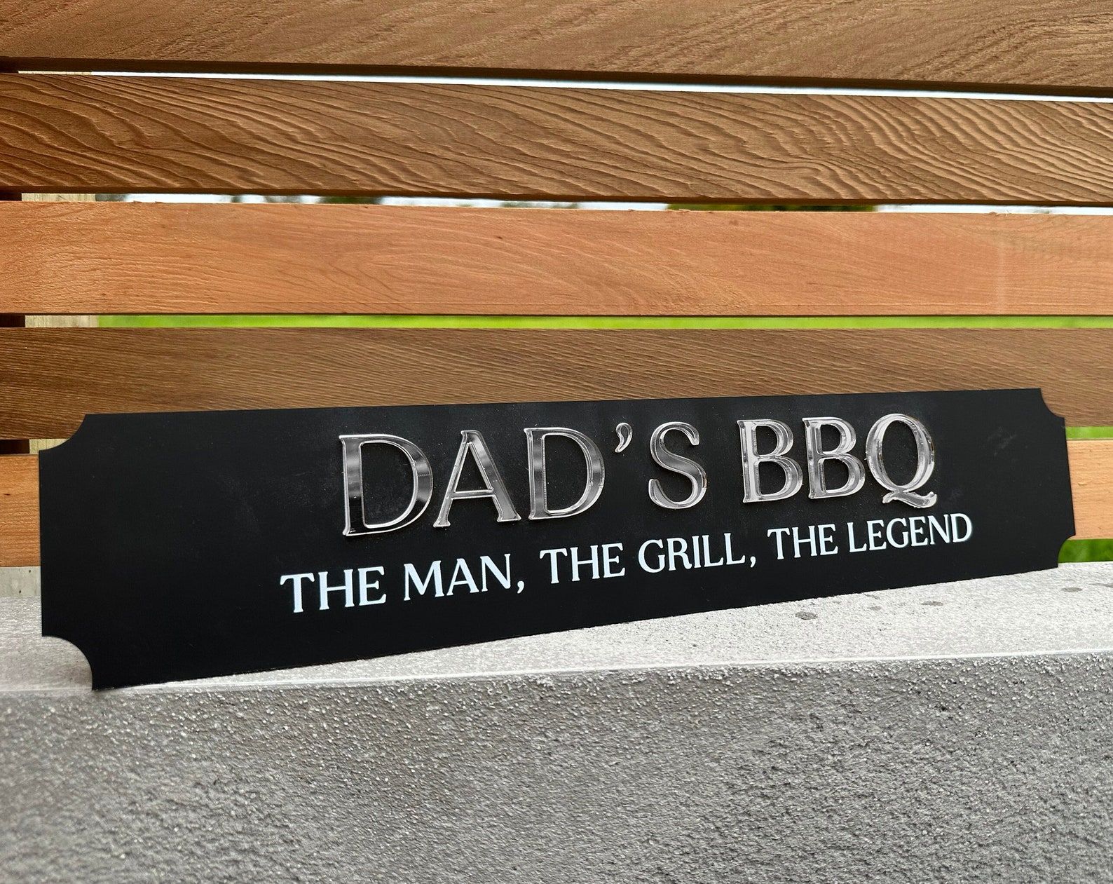 This specific custom sign features a diagonal textured effect with a black background and white text.