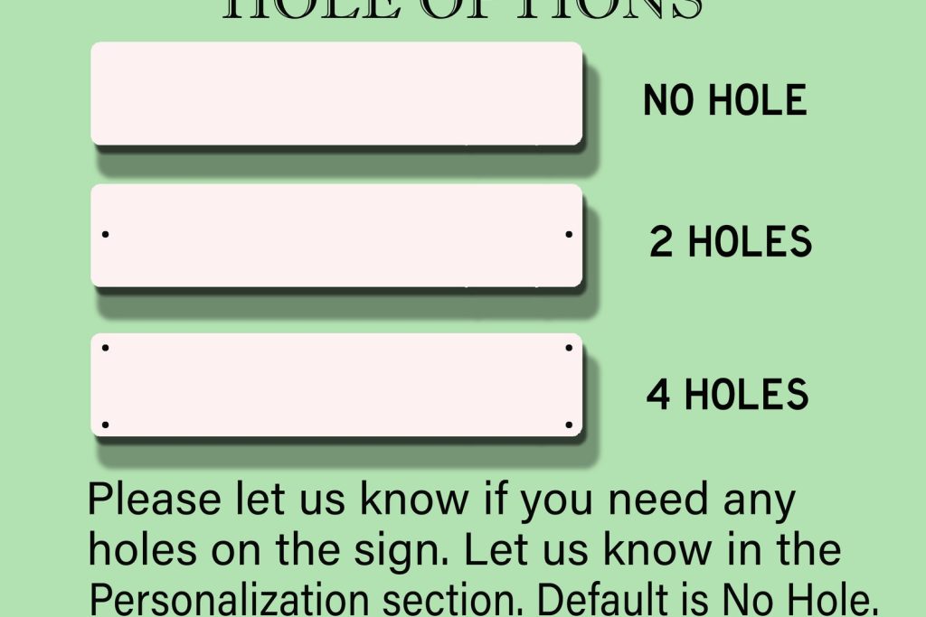 3.tSpecify if you need any holes to be drilled into the sign. Available options: No hole, 2 holes, 4 holes. If you do not specify, we will ship it without any holes drilled.