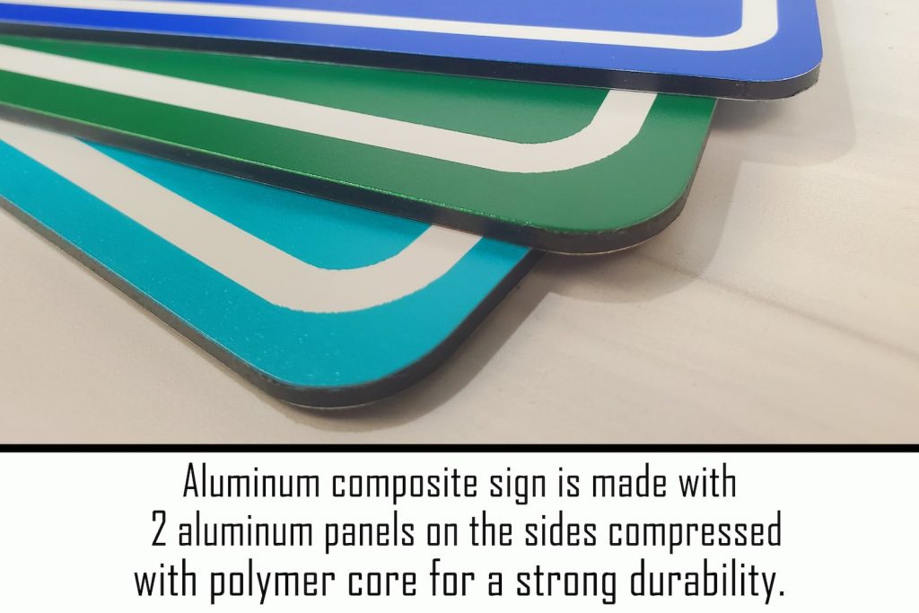 The aluminum composite panel is .125 inch thick. It is comprised of a reinforced synthetic core sandwiched between two sheets of aluminum. This combination is more rigid yet lightweight, making it easy to hang. This sign will not rust. This product is not a decal.