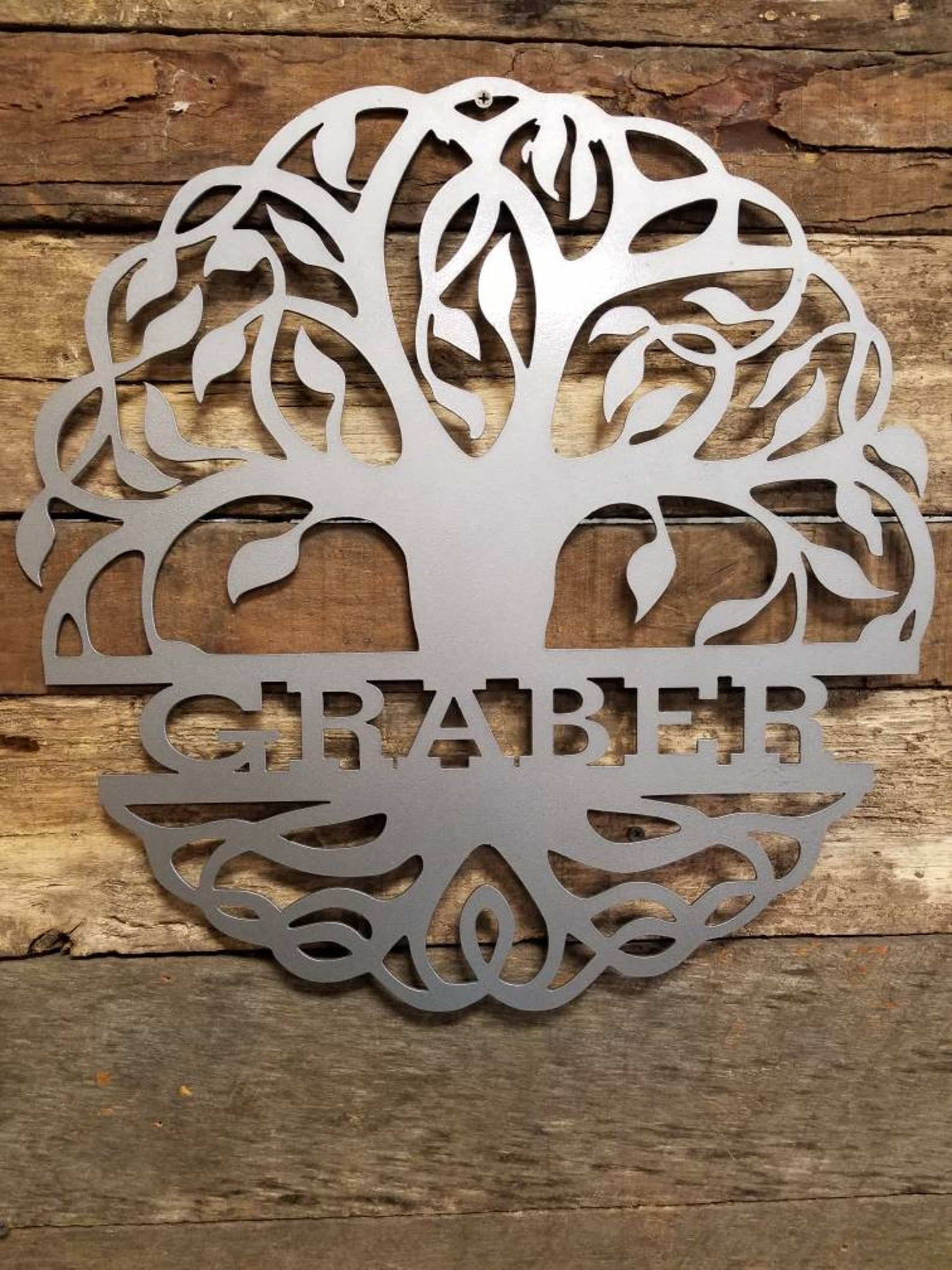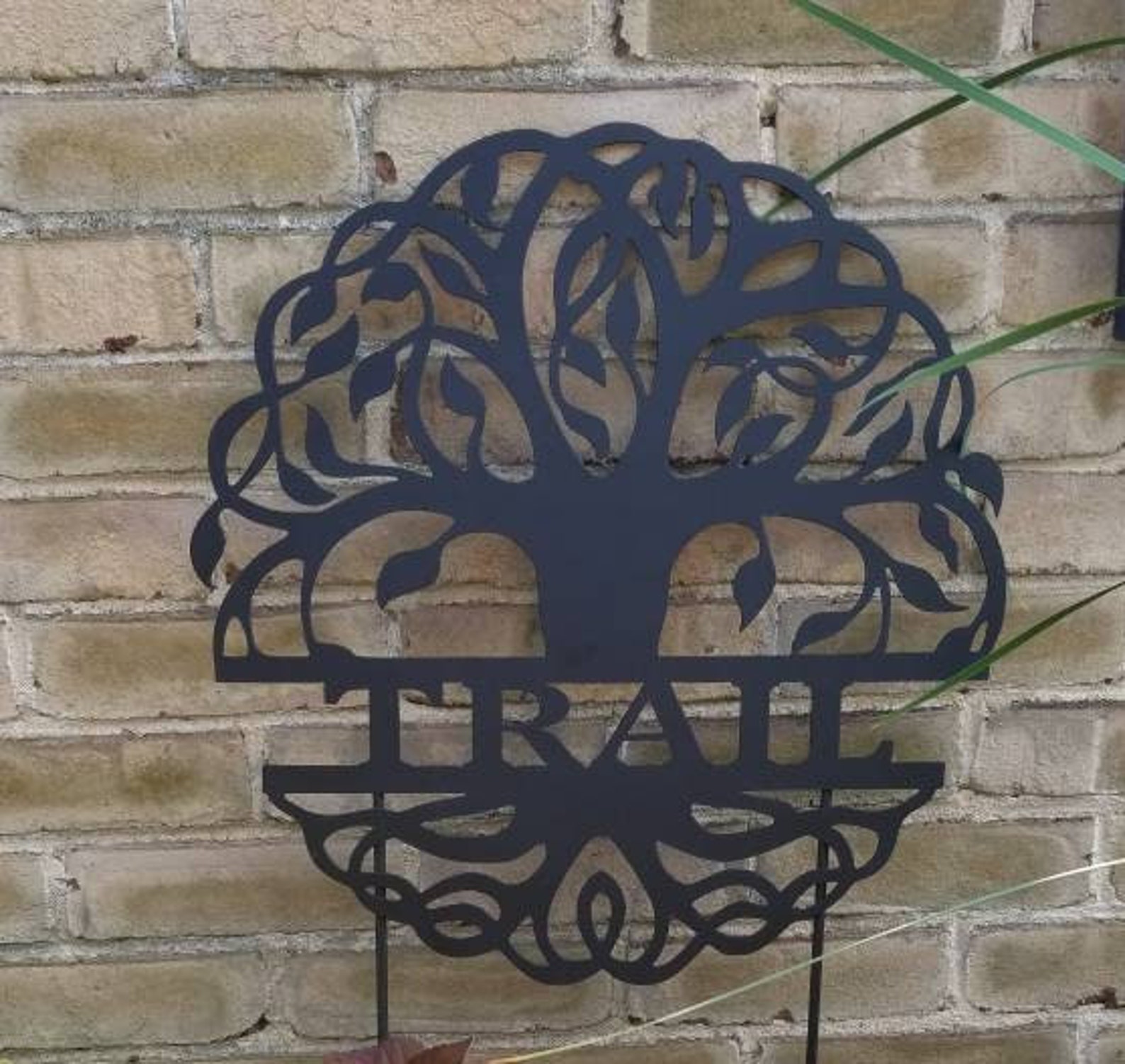 BEST SELLER!! Our personalized tree of life sign measures 18" in diameter and can be ordered with or without garden stakes. When checking out, please include name, up to 10 characters. We cut all of our designs from American Made, 16 gauge sheet metal, so it isn9;t thin and flimsy, but also not too heavy to easily hang and transport.