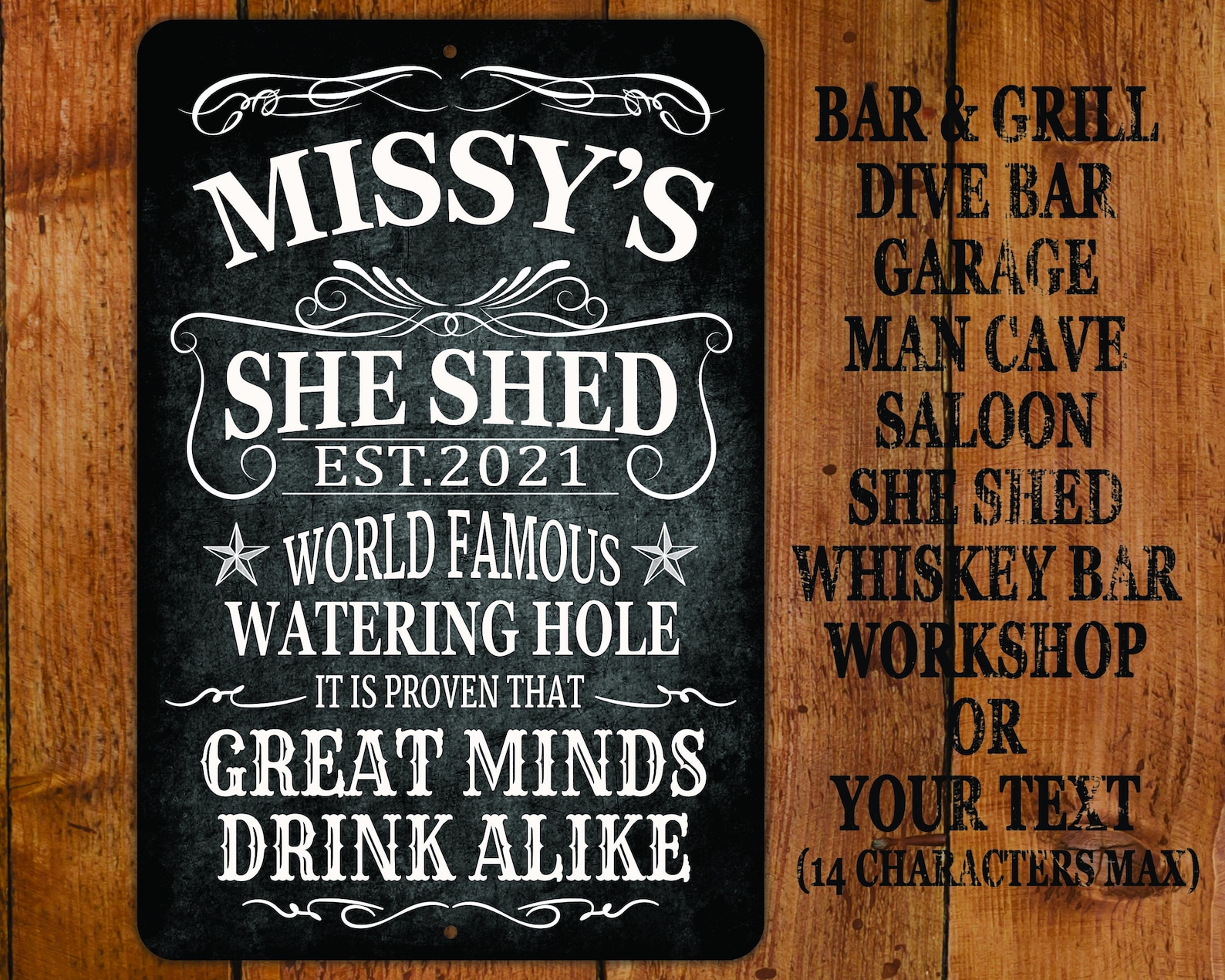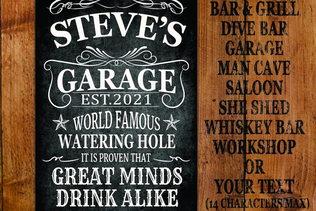Personalized Black Vintage Style Metal Bar Sign | Great Gift | Customize this sign with your first name, last name or whatever bar name you want. First pick a location–you can use one of our choices or provide your own! Man Cave, Home Bar, Pub, Garage, Tavern, Workshop, She Shack, Game Room or your favorite getaway retreat | Designed with a weathered, antiqued look that will make your special place all yours!
