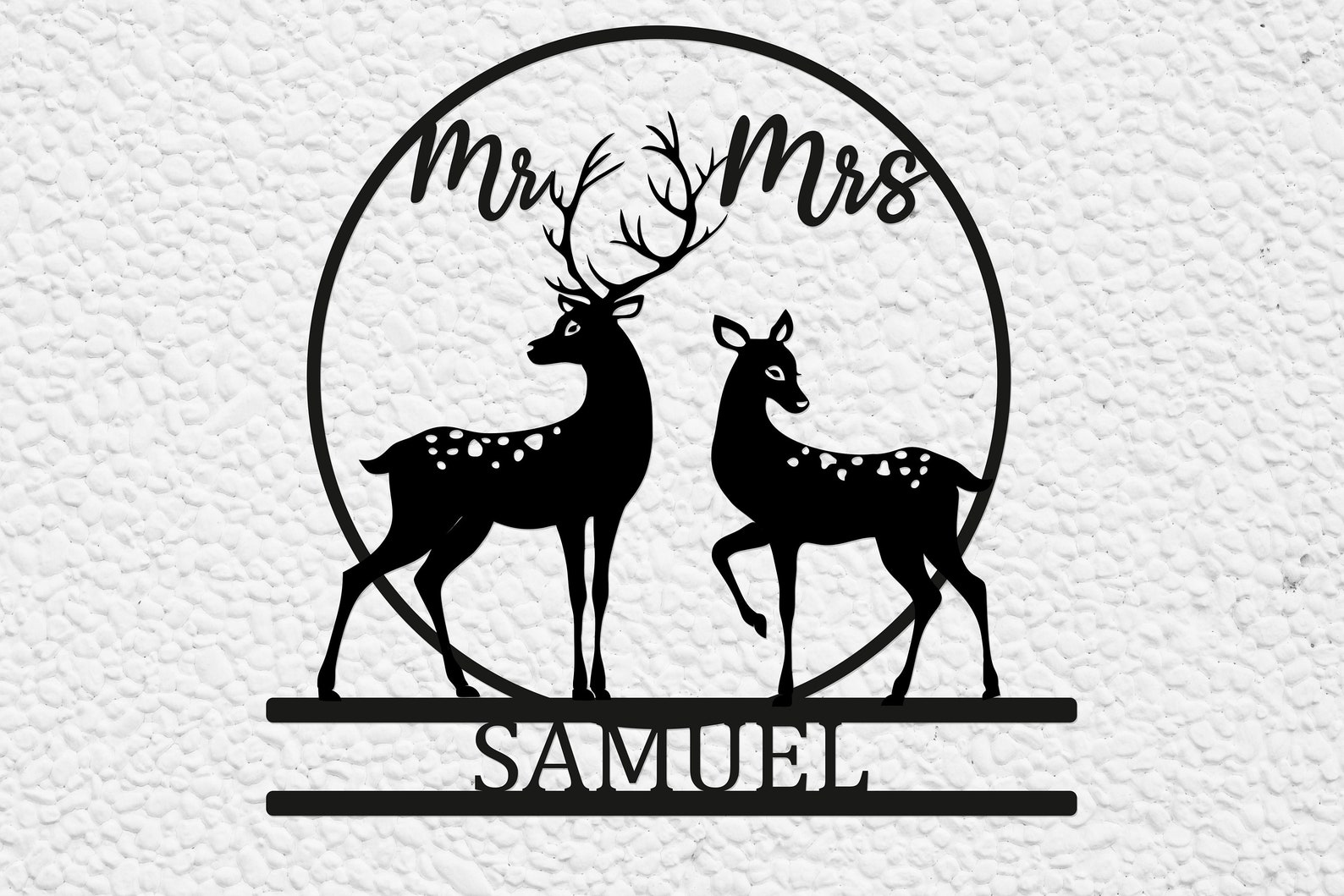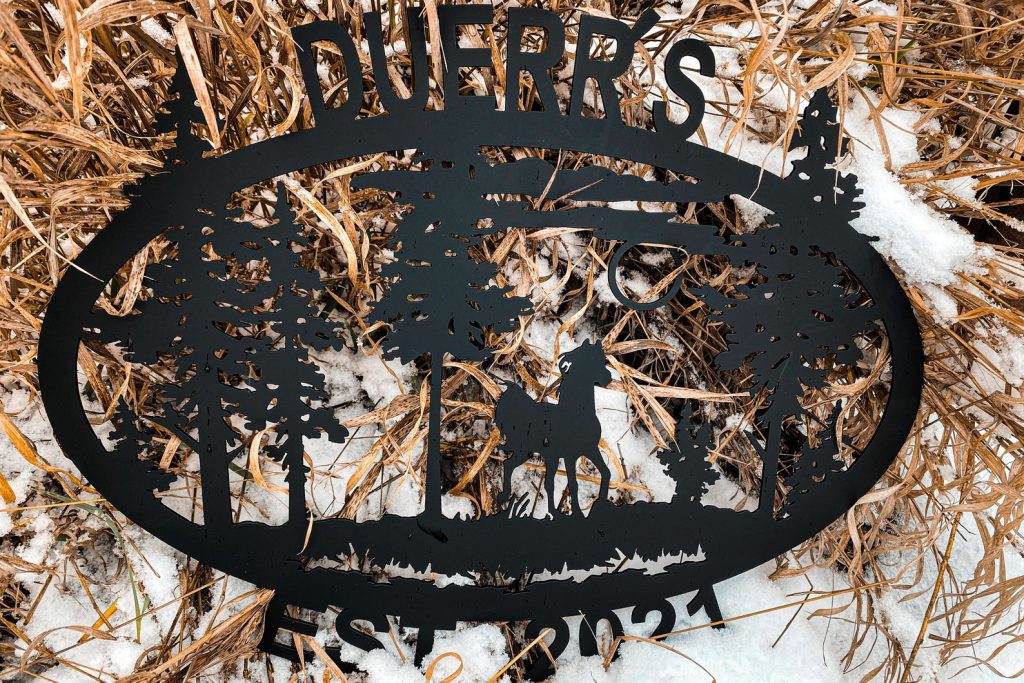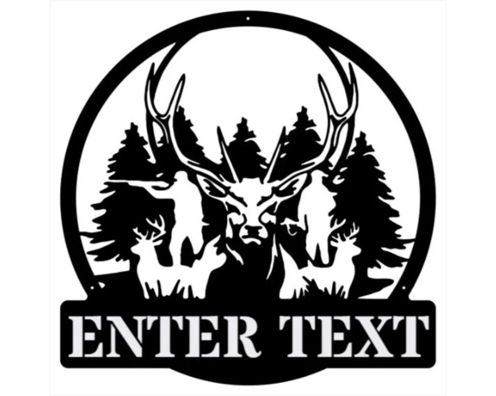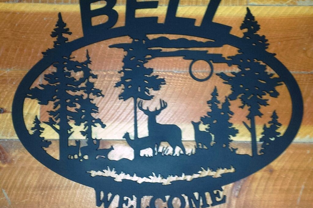 This is an oval silhouette "WELCOME" sign with detailed wildlife scene. This 16 gauge thick metal sign will have "WELCOME" at the bottom and will be personalized with your last name at the top. Your choice of four different silhouettes designed for this shape: a detailed deer, elk, horse, or bear scene. Your sign will measure approximately 21.5"W x 17"H, though keep in mind the size may vary depending on your personalization, and will have a matte black powder coat finish and can be used inside or out.
