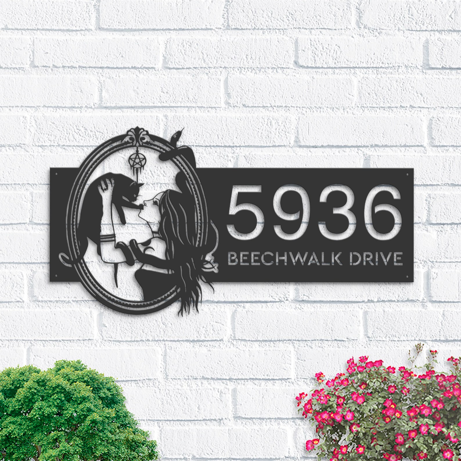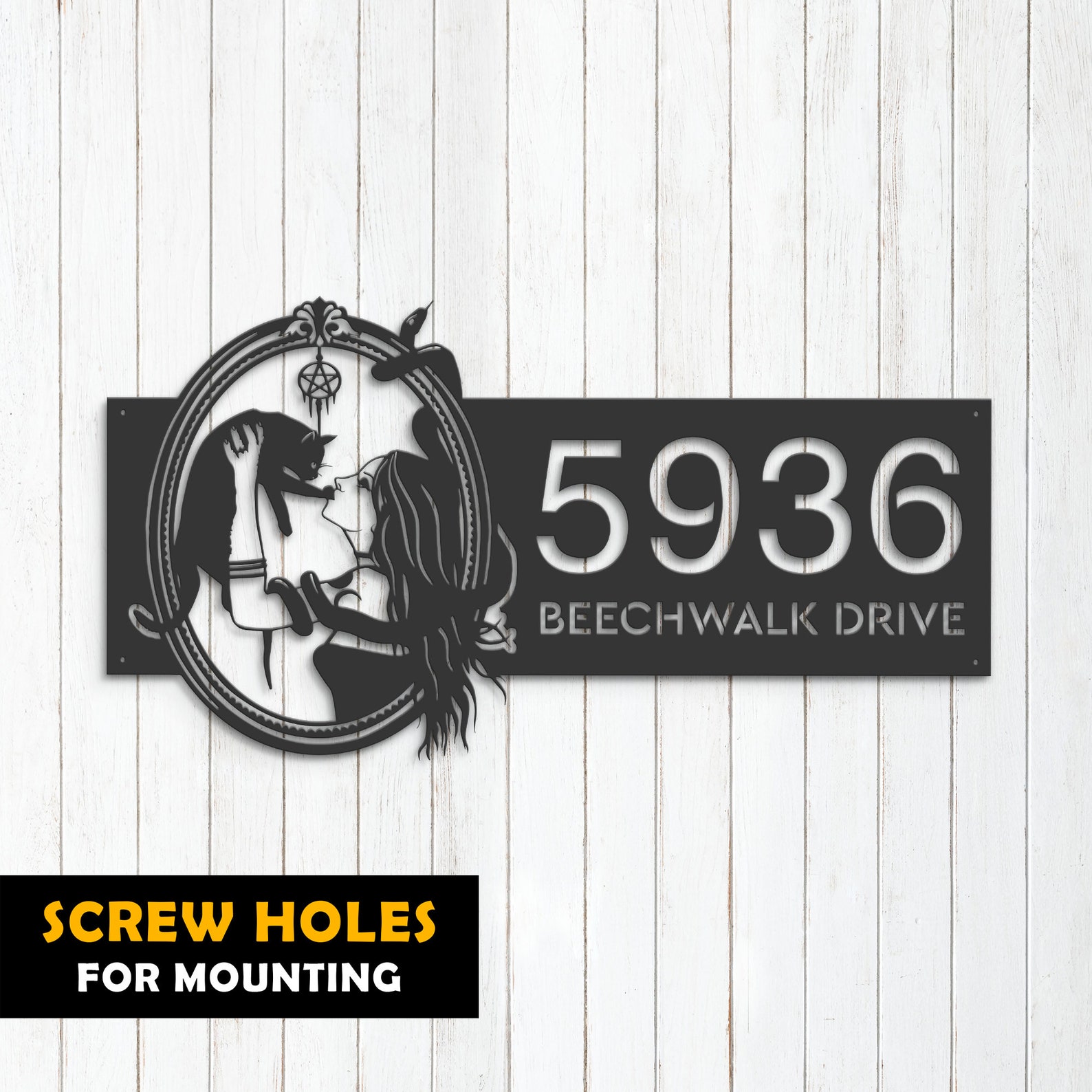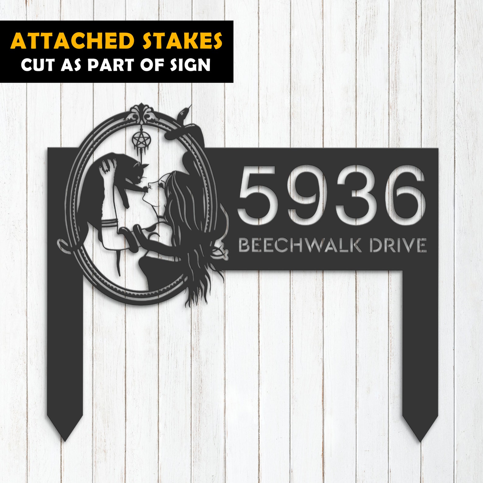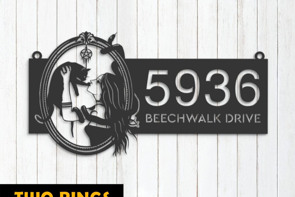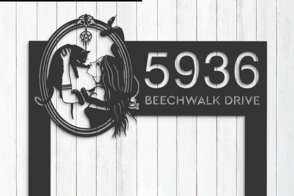Be the first to review “Personalized Witch and Black Cat Metal Address Sign – Halloween Decor”