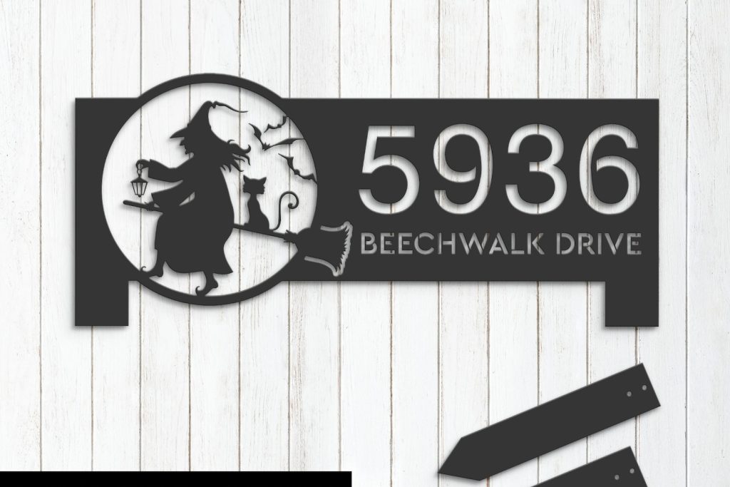 Personalized Witch & Black Cat Halloween Metal Address Sign