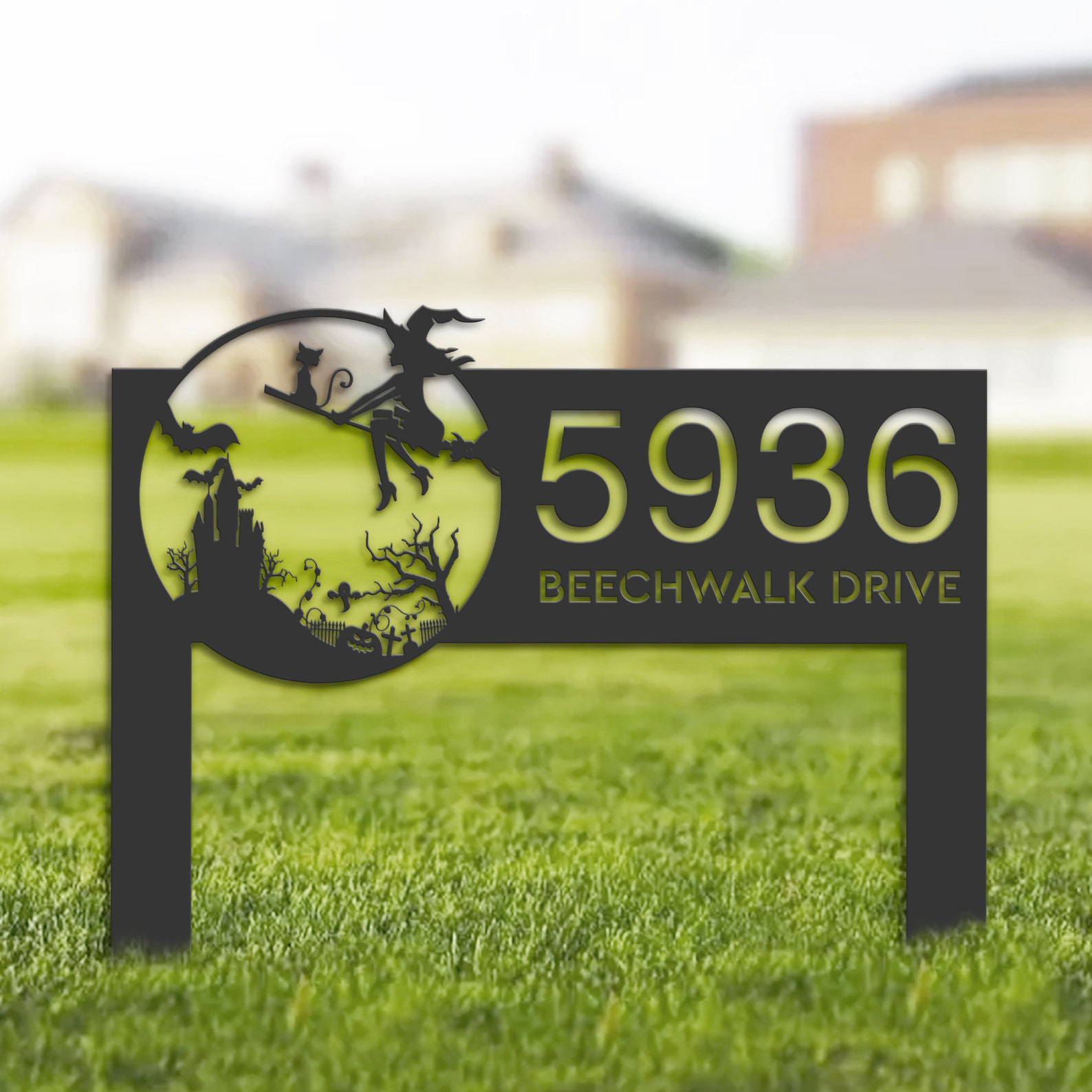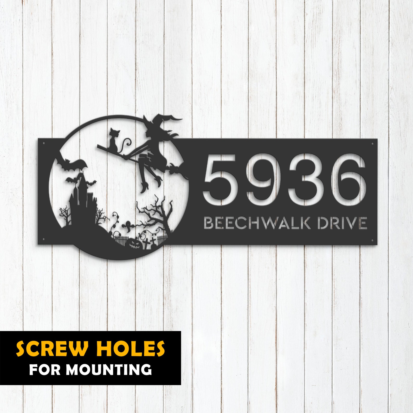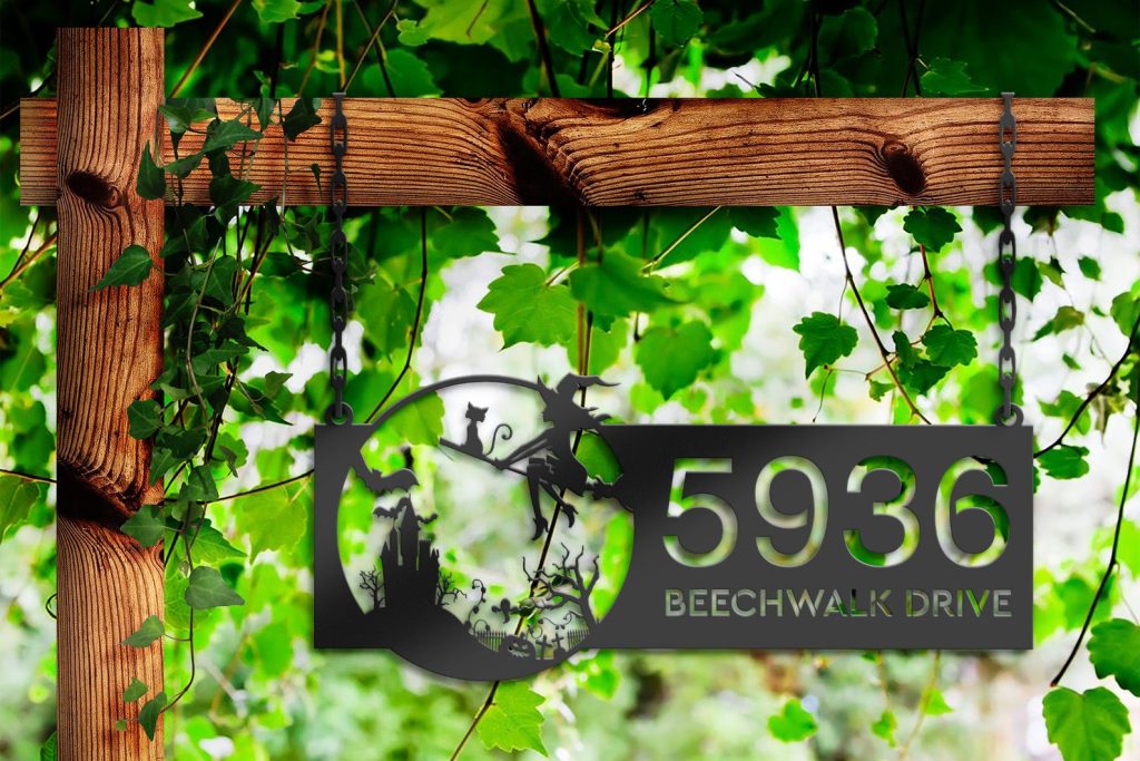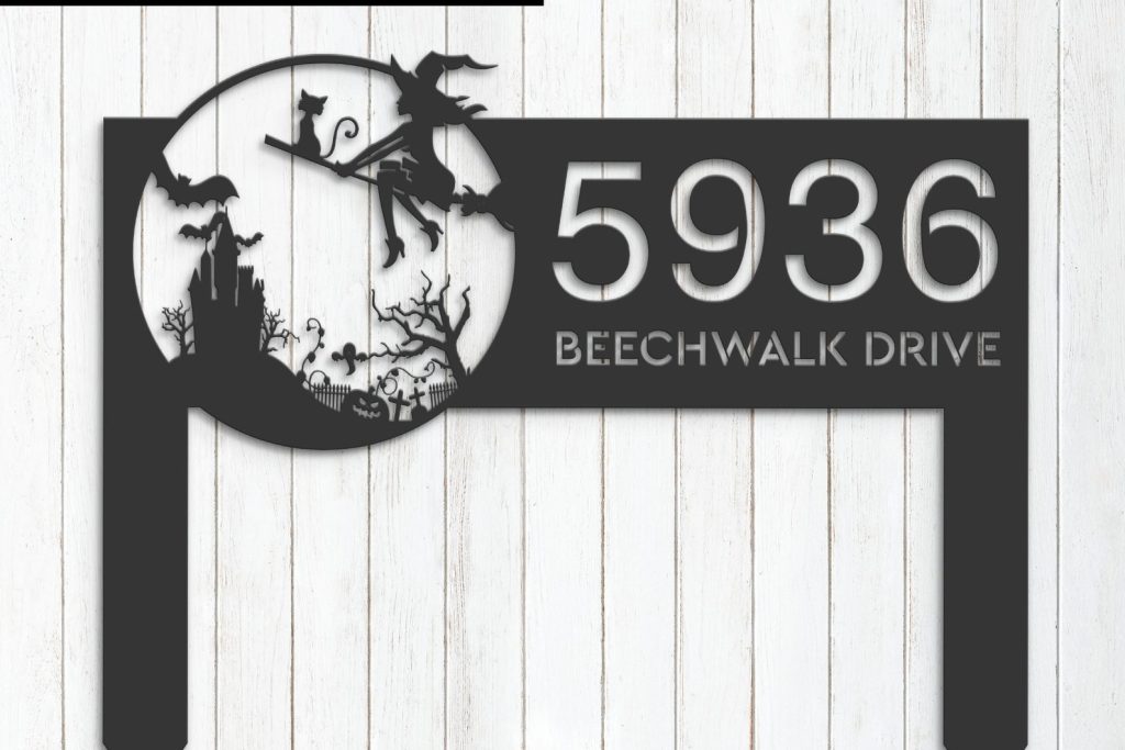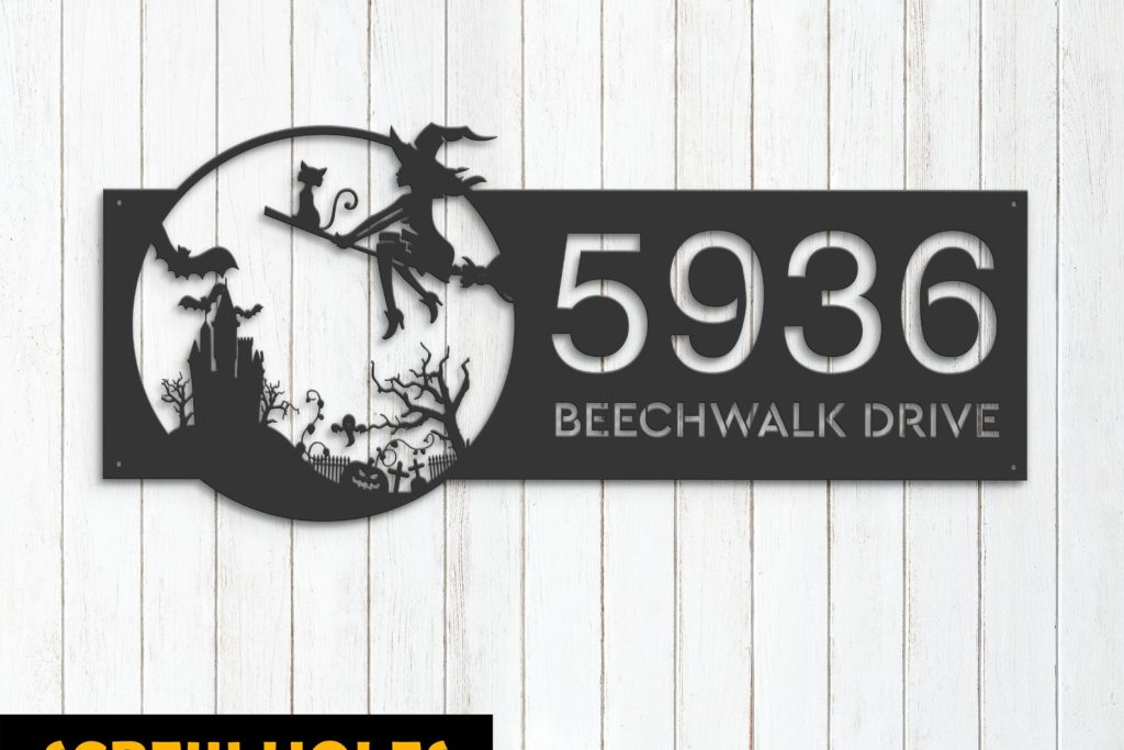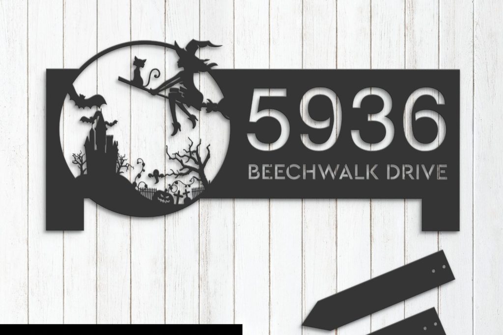 Personalized Witch & Black Cat Halloween Metal Address Sign
