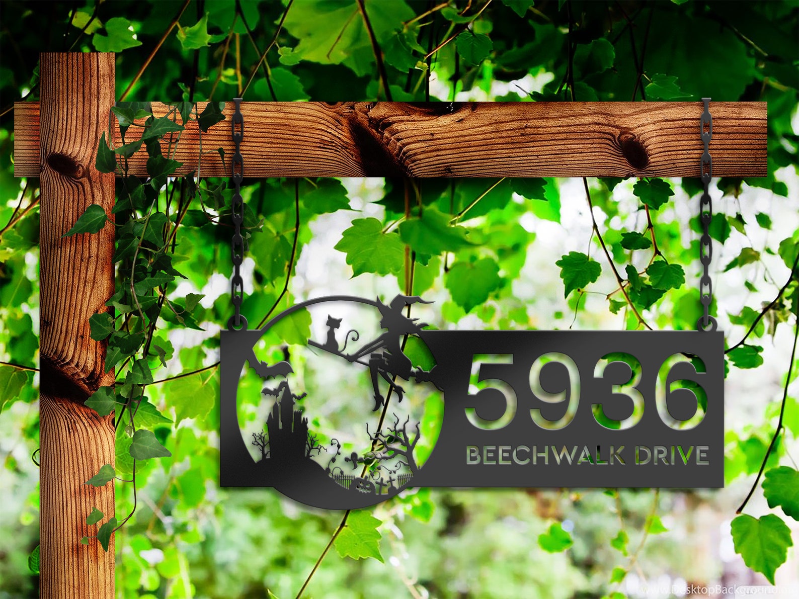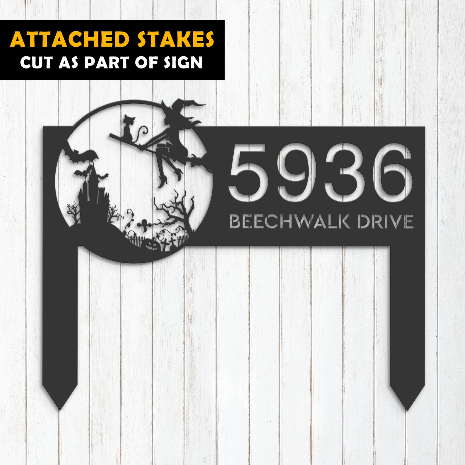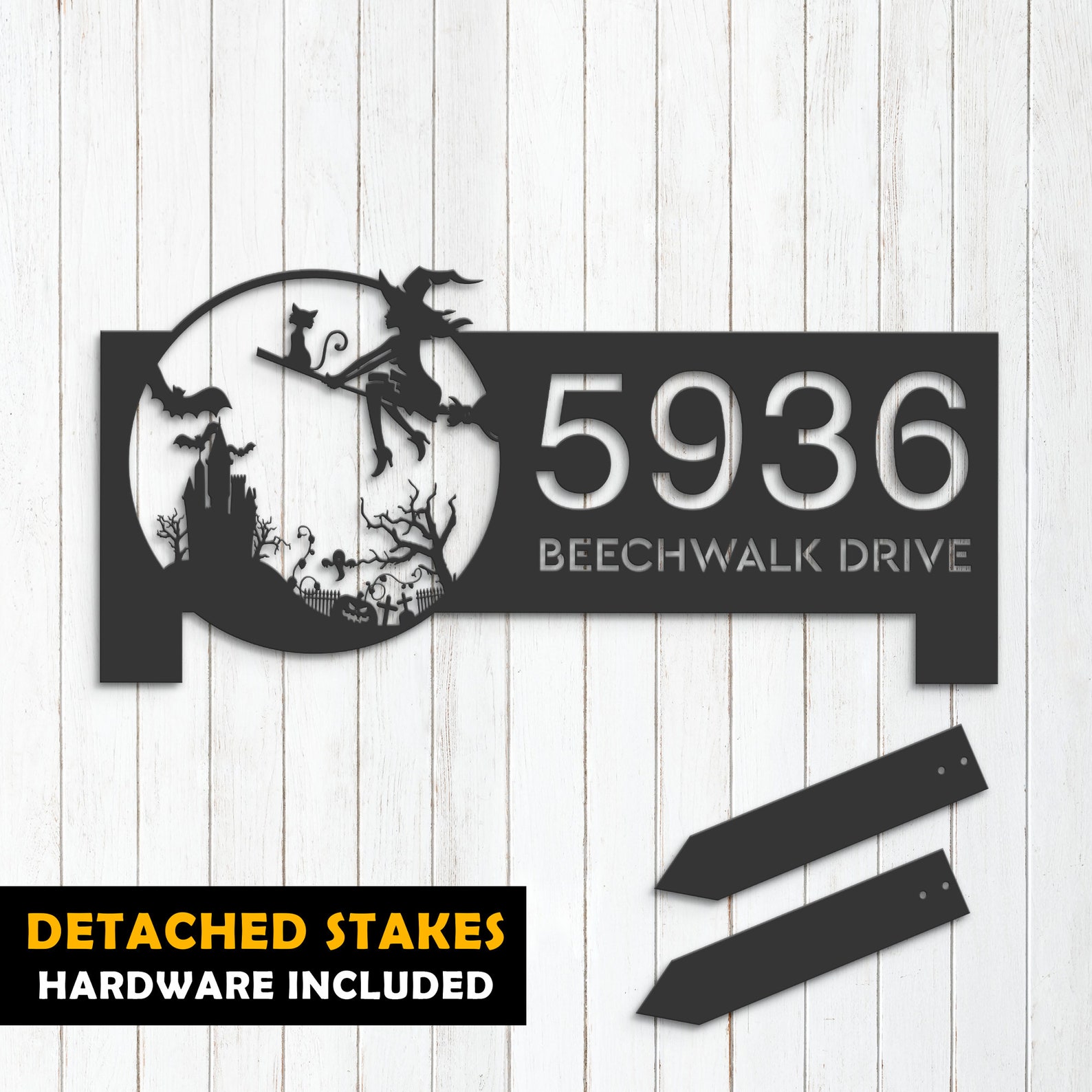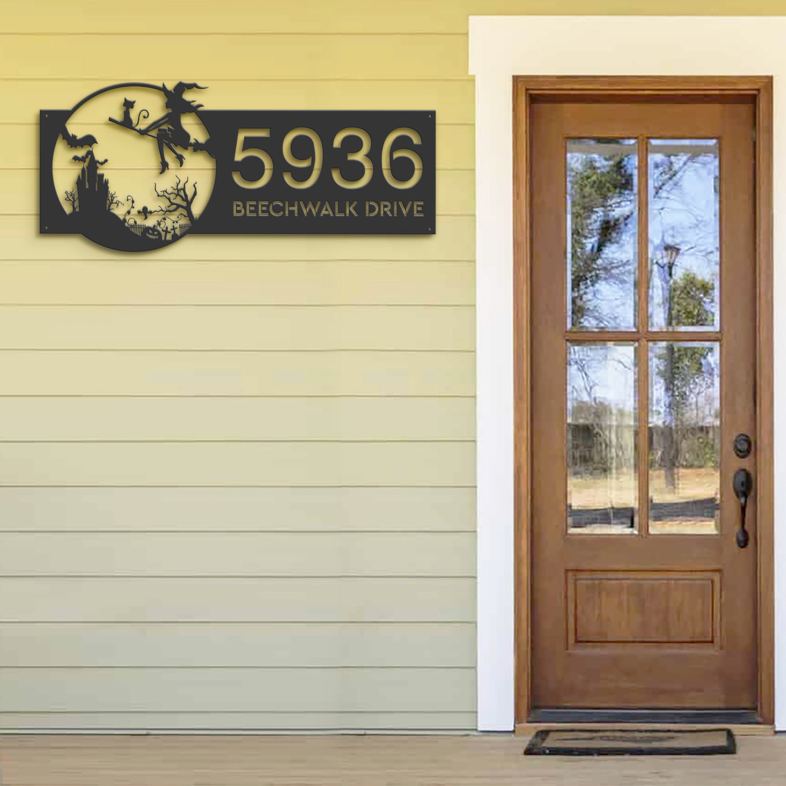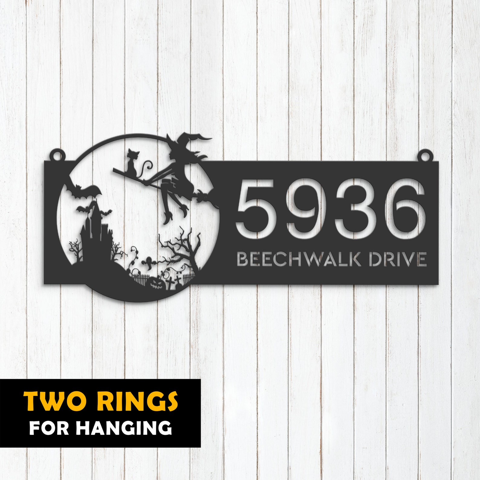 Personalized Witch & Black Cat Halloween Metal Address Sign