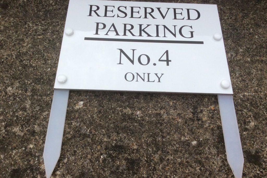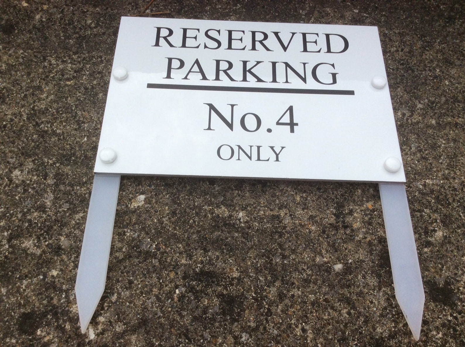 White 3mm Aluminium with black lettering with strong 5mm acrylic legs. Weatherproof and long lasting