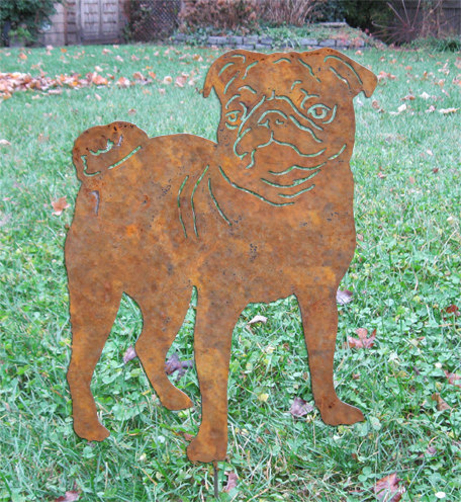 This handcrafted rustic metal Pug Garden Stake or Wall Hanging (option) will become a decorative favorite. A charming way to add some fun to your home, lawn or outdoor garden decor.