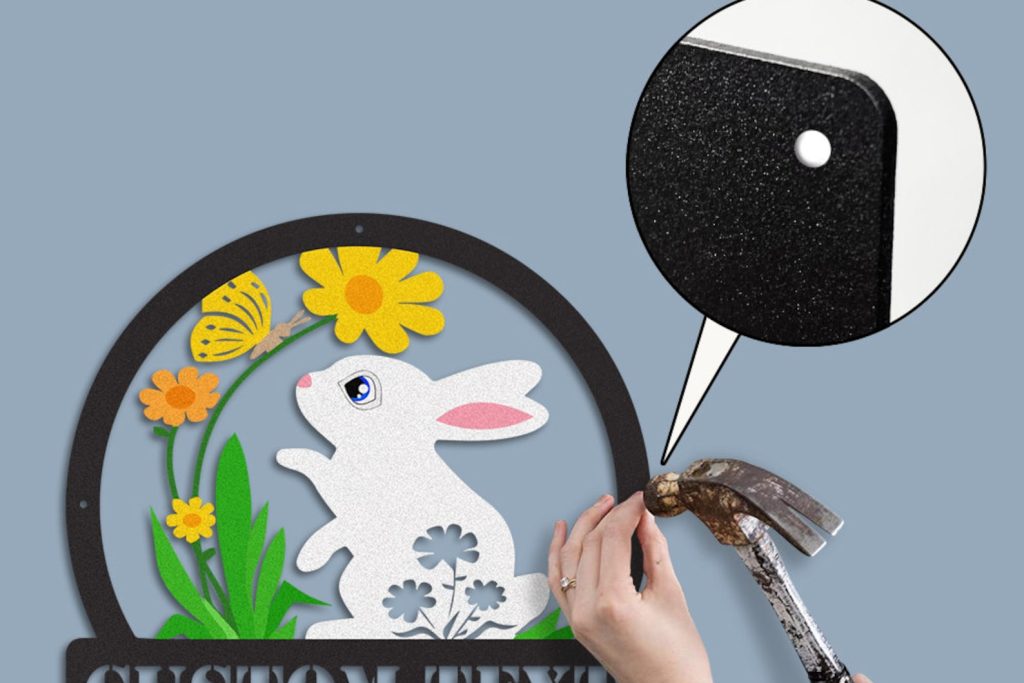 asy to hang — There are holes for you to hang metal signs. You just need to find a suitable place and position it with a hammer. The design of two or more holes can make the name sign more stable, dont worry about it falling or something. The nut can hide the screw without affecting its beauty.