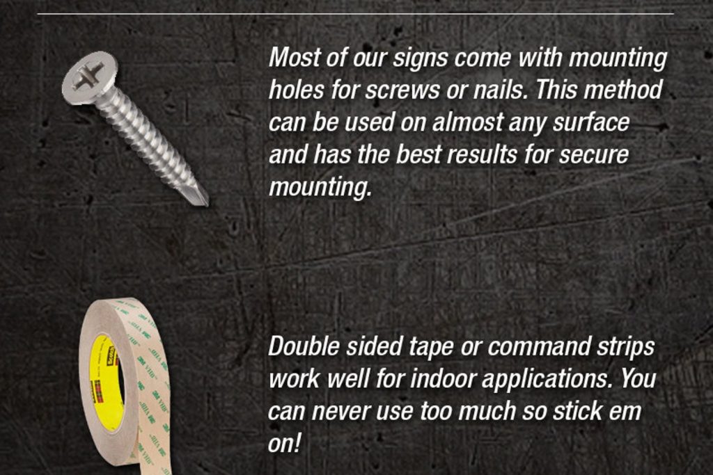 Holes are added to signs for easy hanging, you can use finish nails, screws, or heavy duty double sided tape. We do offer .5 risers and screws for mounting, which can be found in our listings.