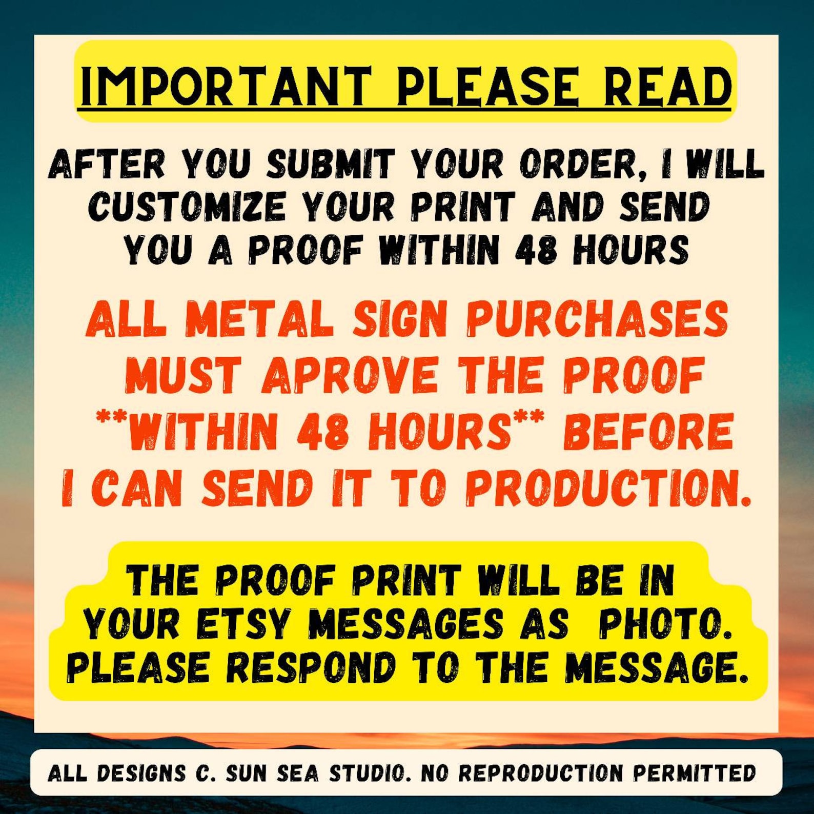 Welcome to Sun Sea Studio. This is a Customized Printed Metal Sign created by Stacy, the owner of Sun Sea Studio.