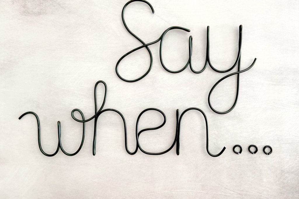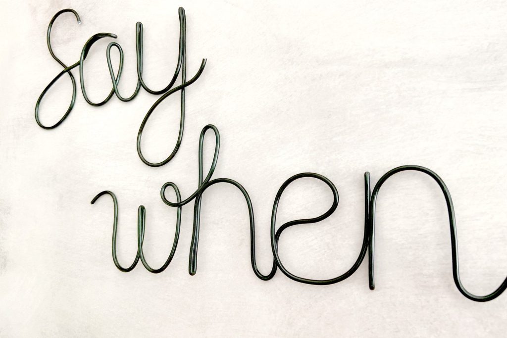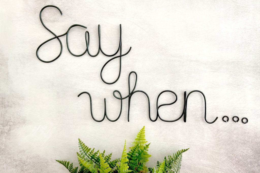 Say when… is a quirky phrase that has a fun and modern vibe for your kitchen or home bar wall. You can arrange the words to fit your style on any wall in your home.