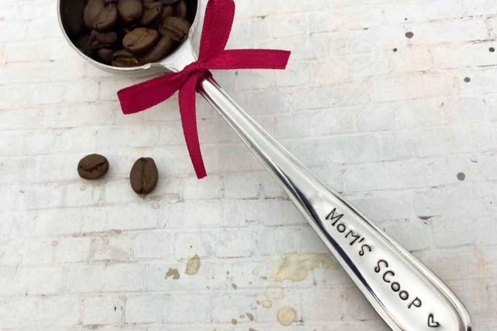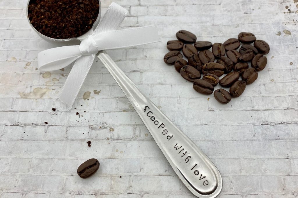 Scooped with love metal coffee scoop for coffee lovers. Unique unisex gifts for him and her. Customizable hand-stamped message. Non toxic food safe finish.