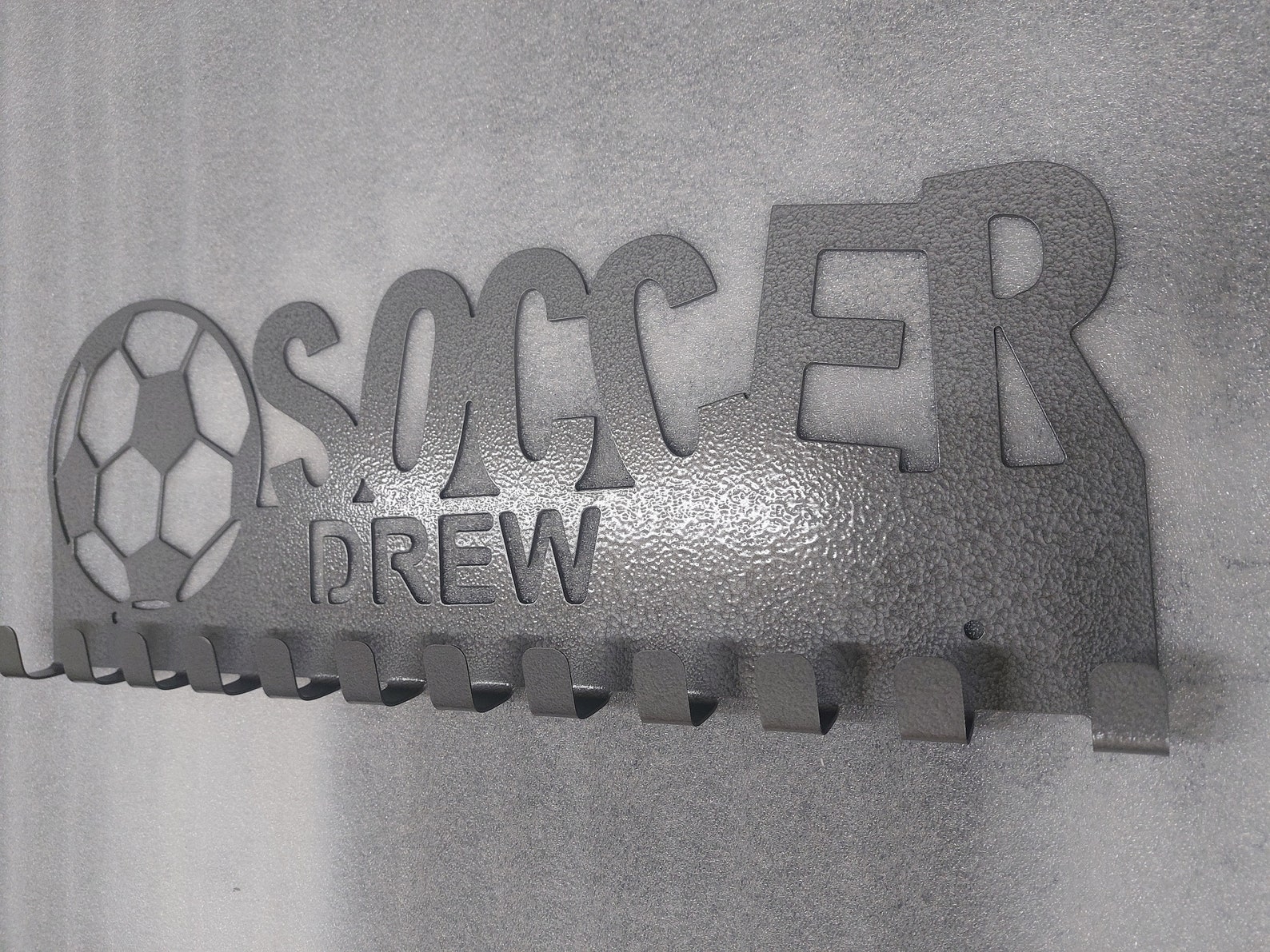 Display your favorite athletes medals with this customizable soccer medal holder. It is cut from heavy duty 16-gauge steel, so it wont be weighed down with all their awards! This product comes with 12 medal hooks with 2 mounting holes 16" on center for secure mounting. Select the paint color that best matches your athlete9;s personality. If you do not see your preferred color available, message me.