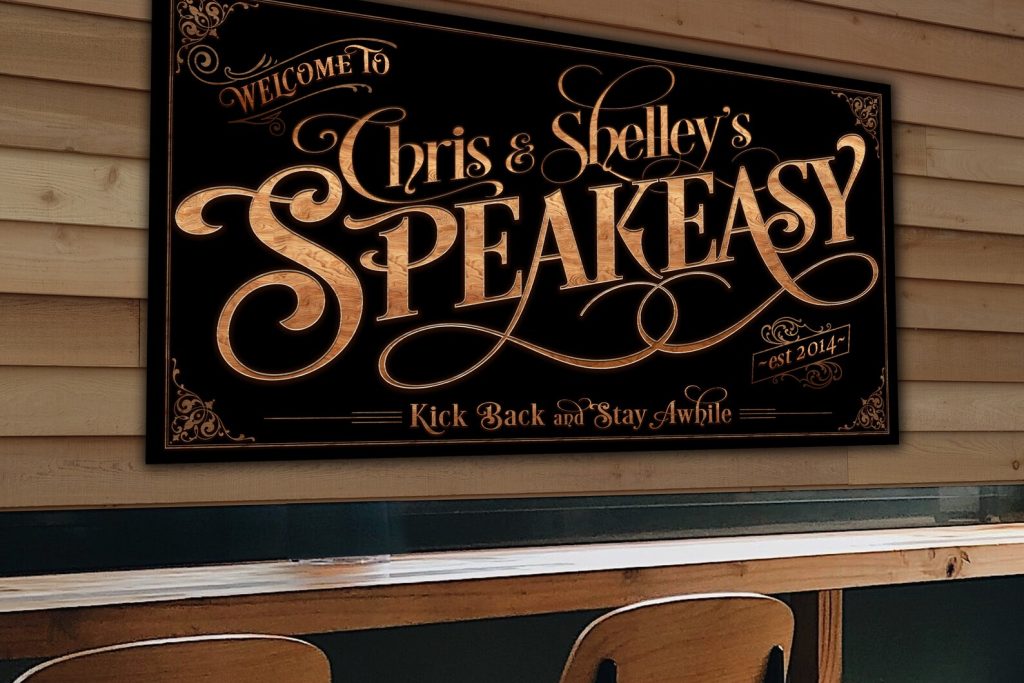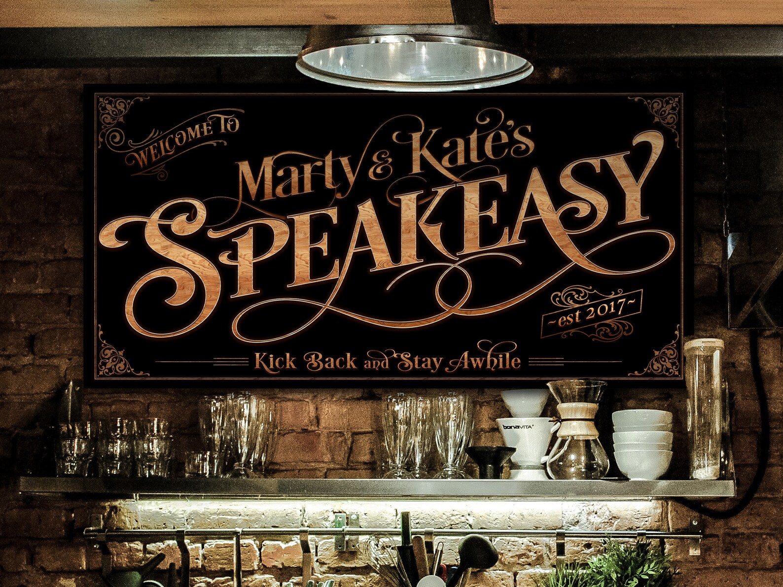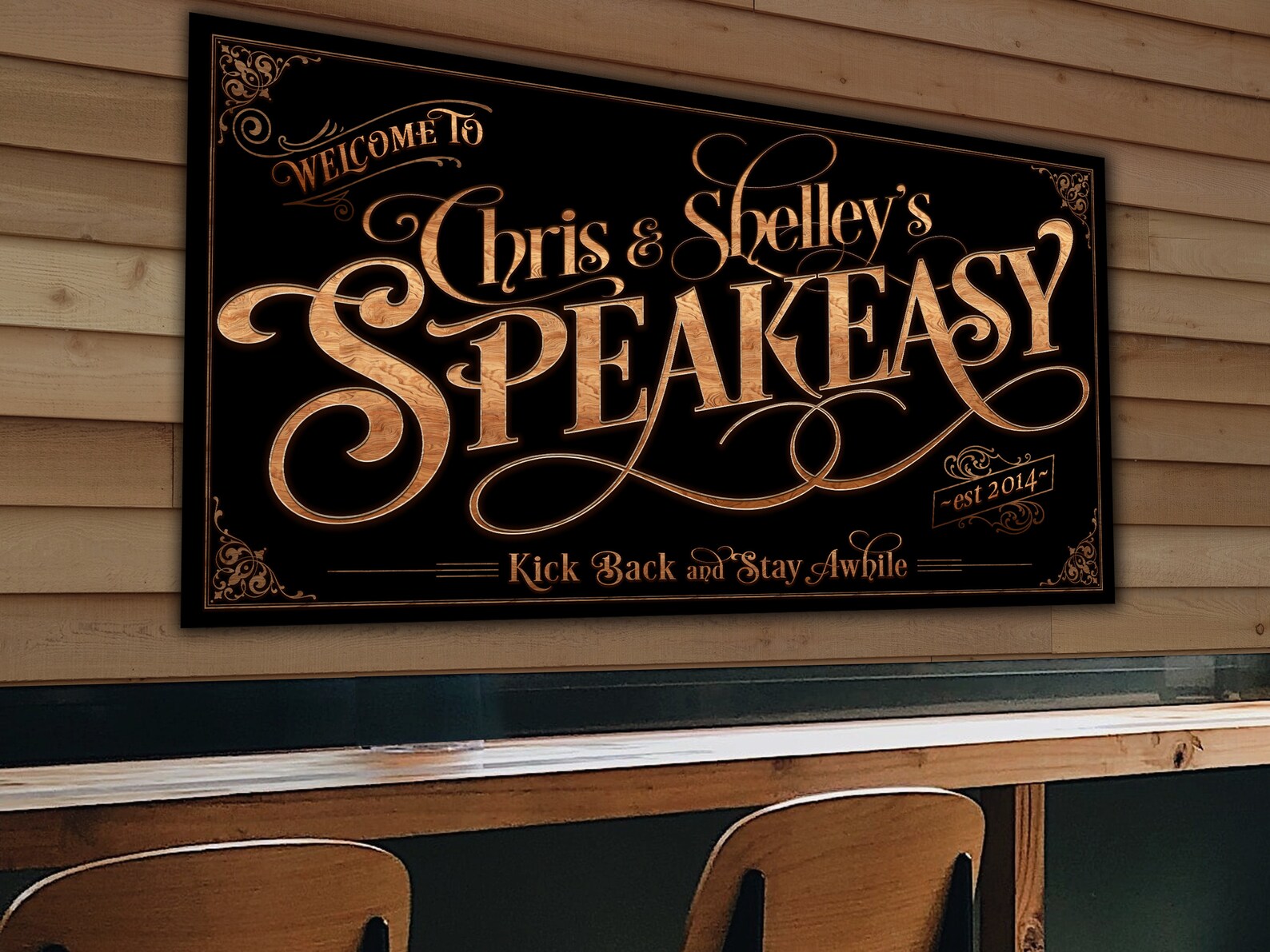 This Personalized Speakeasy Family Name sign offers a modern farmhouse look and feel. I added a wood grain overlay within the fonts and graphic elements. Display this vintage, Speakeasy sign anywhere in your home. It comes in your choice of metal or canvas!