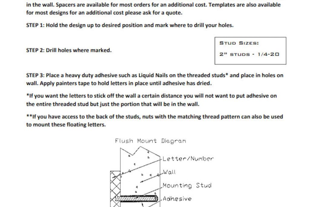 The incl studs will be 2 threaded studs welded to the back of each letter. Typically a letter will have 2 to 4 studs each. Fonts with thin lines (less than thick) may not have enough surface area to weld a stud on the back. Please feel free to inquire prior to purchase. 1 spacers are also available for additional cost. Letters with spacers need lines at least 1/2" thick.