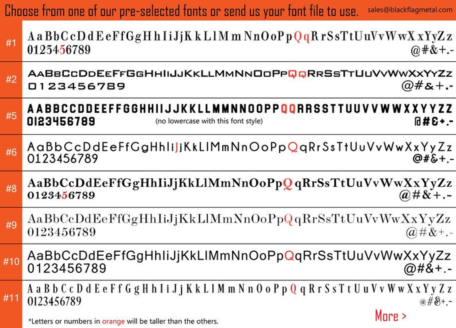 In the listing photos are our fonts #1- #20. These are our most popular fonts. We can also use your own custom font. *