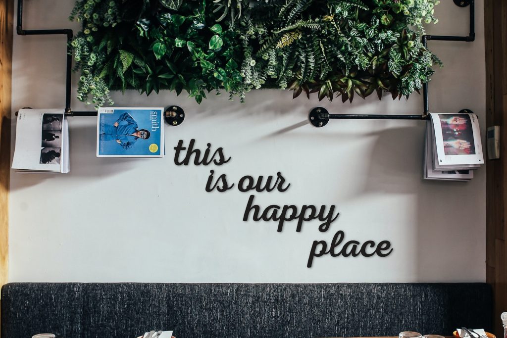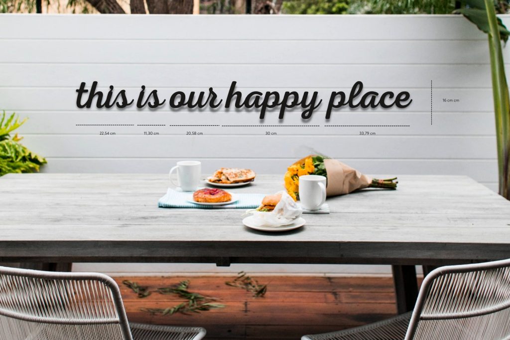WALL DECOR FOR YOUR HAPPY LIVING ROOM – The Norn Modern "this is our happy place" word wall letters come pre-painted on black metal. Place them in your living space to add a humorous tone to the room.