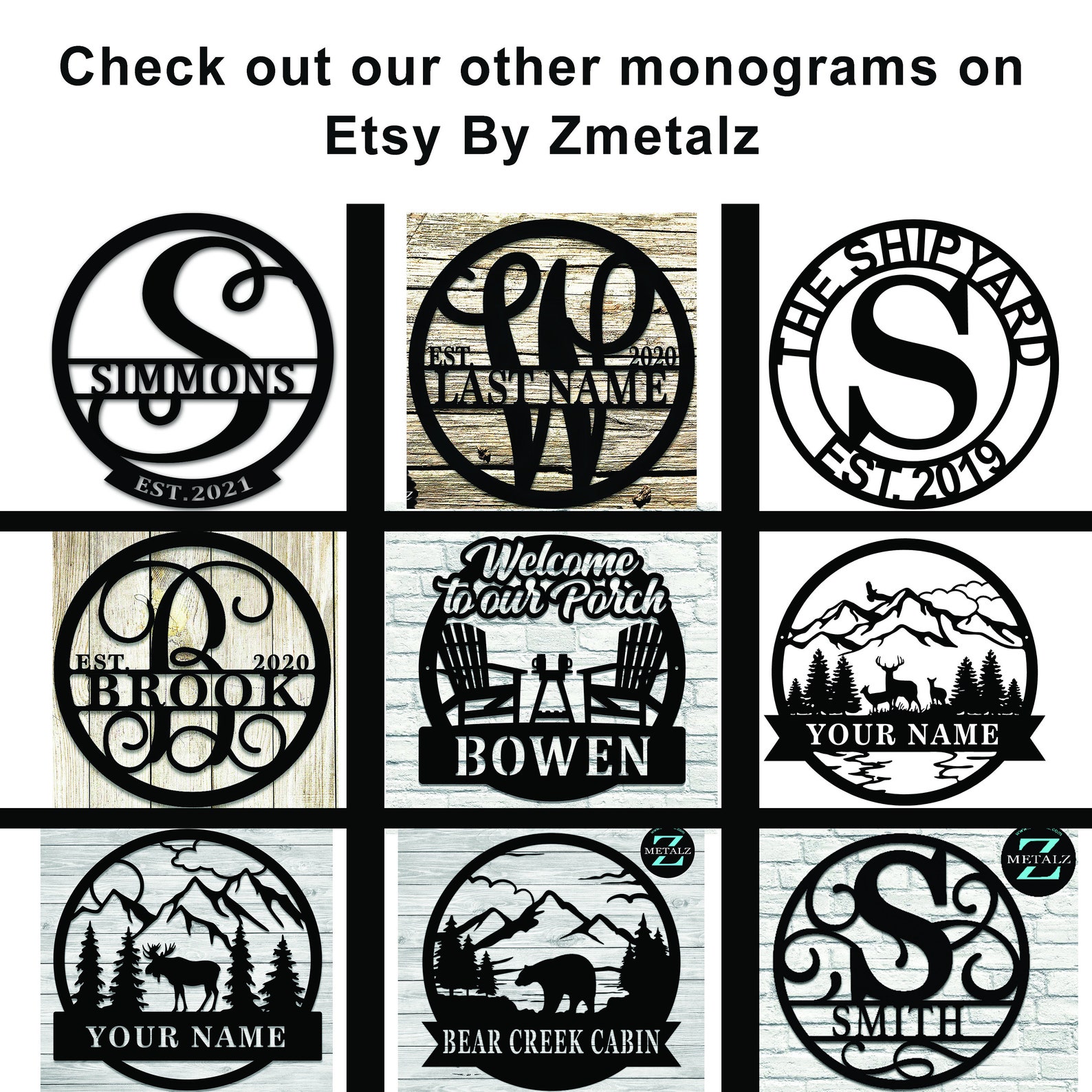 Monogram sign made out of 16 gauge steel then powder coated in the color of your choice.