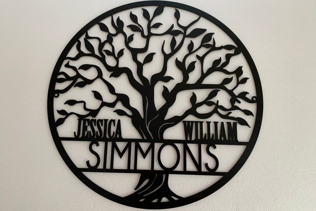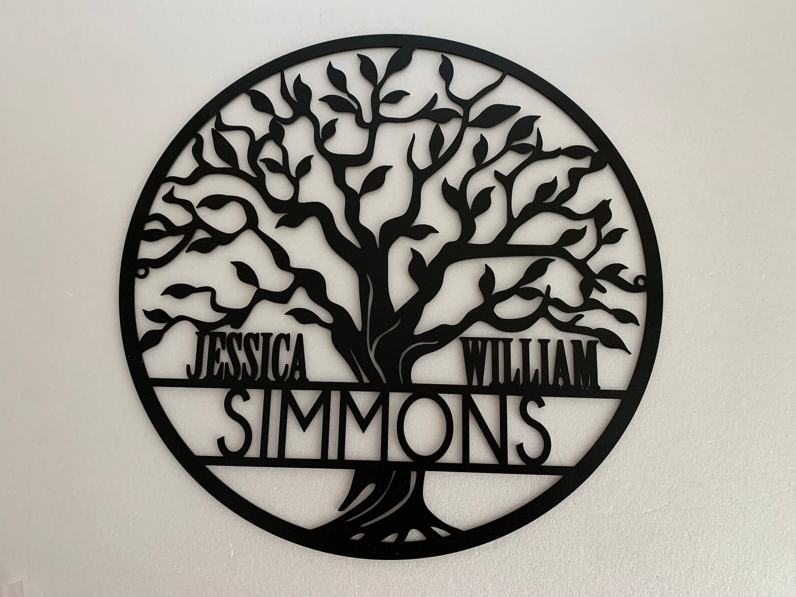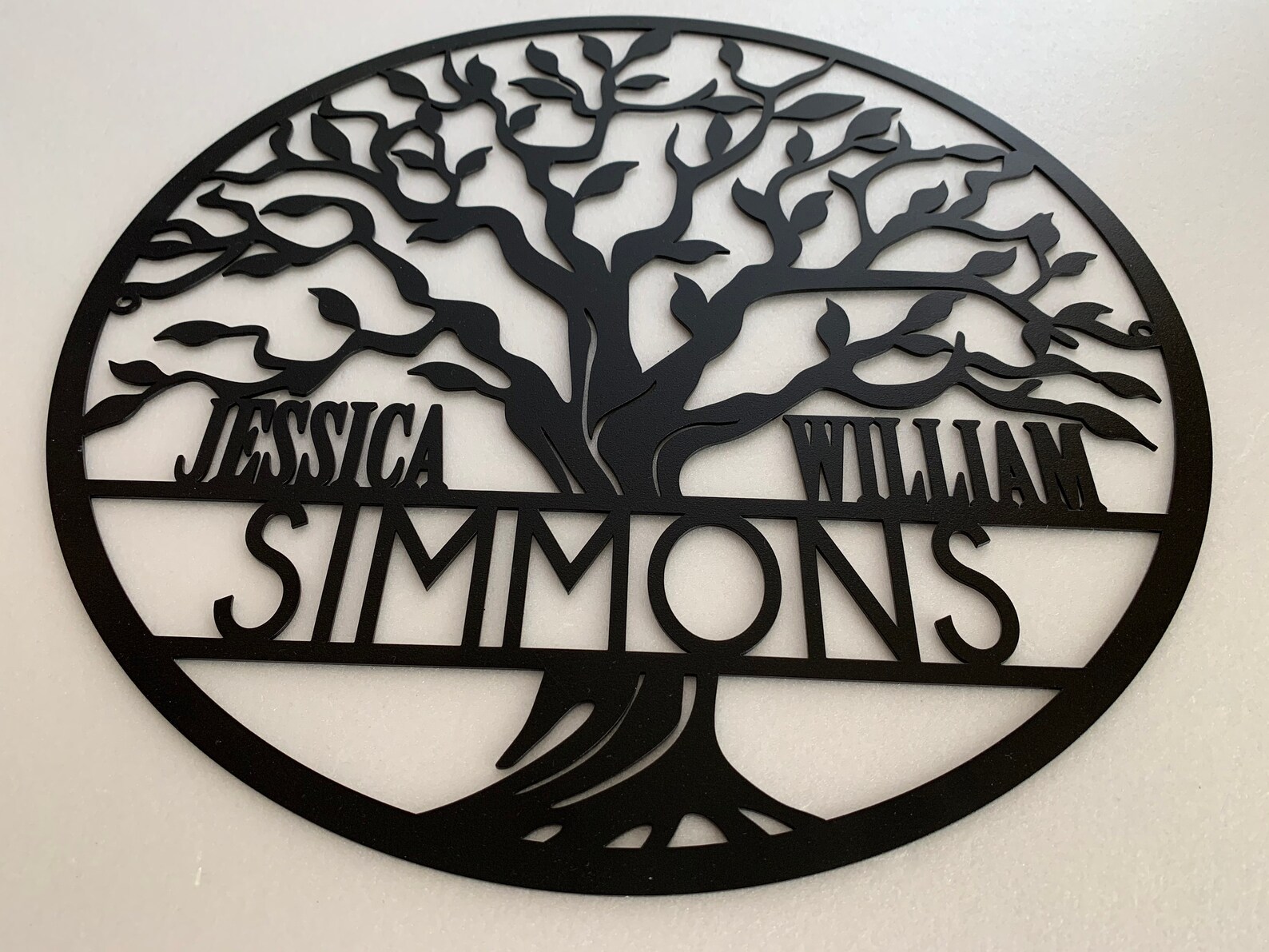 Custom last name metal sign with a couple of first names. Tree of Life sign.