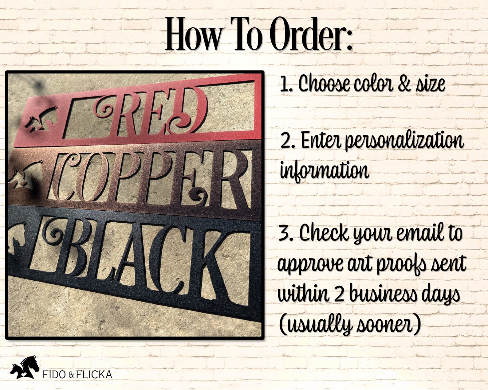 Made with 18 gauge steel and powder coated in your choice of 3 colors, this sign is built to withstand the elements for years of enjoyment. Add a touch of elegance to your home on the inside, outside, or both!