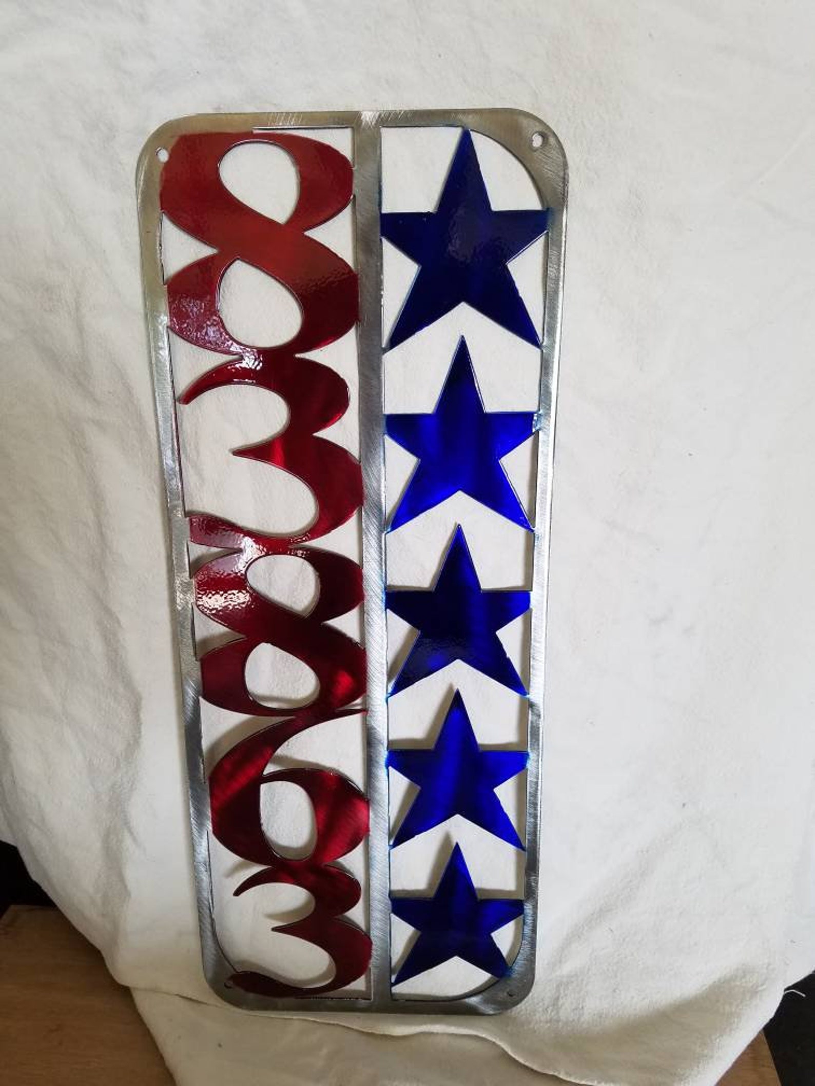Custom designed American Flag inspired vertical metal address plate. Plasma cut from 16 gauge cold rolled steel and added holes for mounting on house or fence, screws not incl. Choose from heat blued with clear coat, shined metal with clear coat, white, black, bronze. All items are powder coated giving them lasting uv protection and durability.