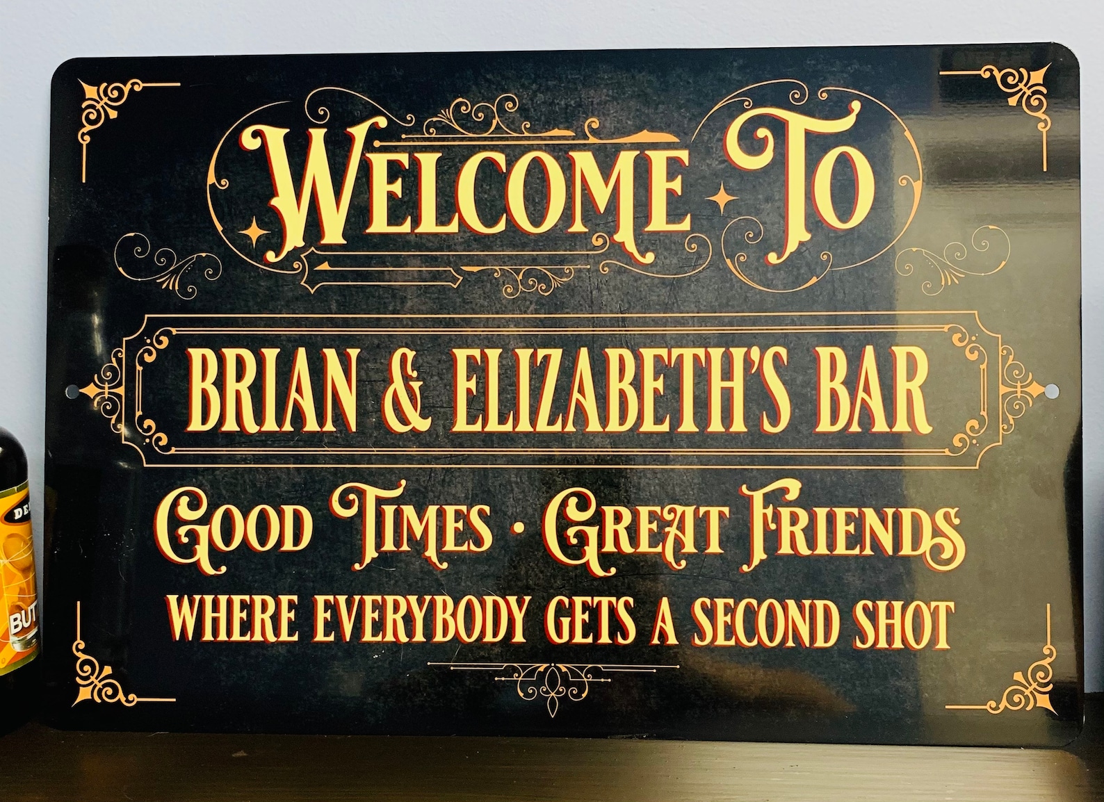 Personalized Vintage Design Metal Bar Sign | Customize this sign | Great Gift | Customize this sign with your personal bar name. Designed with a vintage antiqued look. This sign will look great in any bar, home bar, basement, garage, deck, or patio.