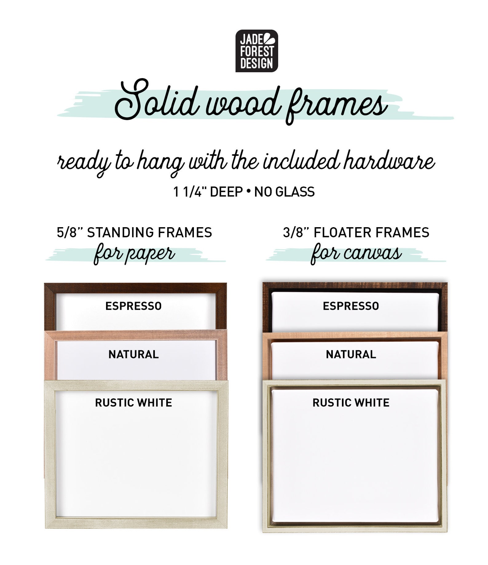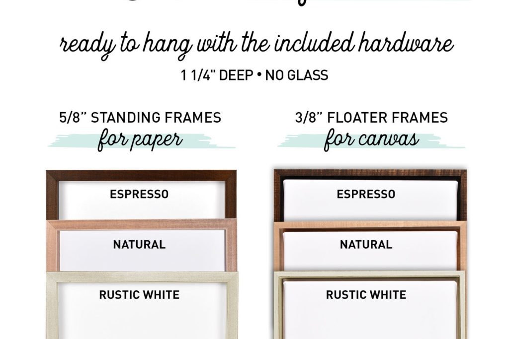 Add a NATURAL, RUSTIC WHITE, or ESPRESSO solid maple-wood frame using the drop-down menus when placing your order. Hanging hardware incl, NO GLASS.