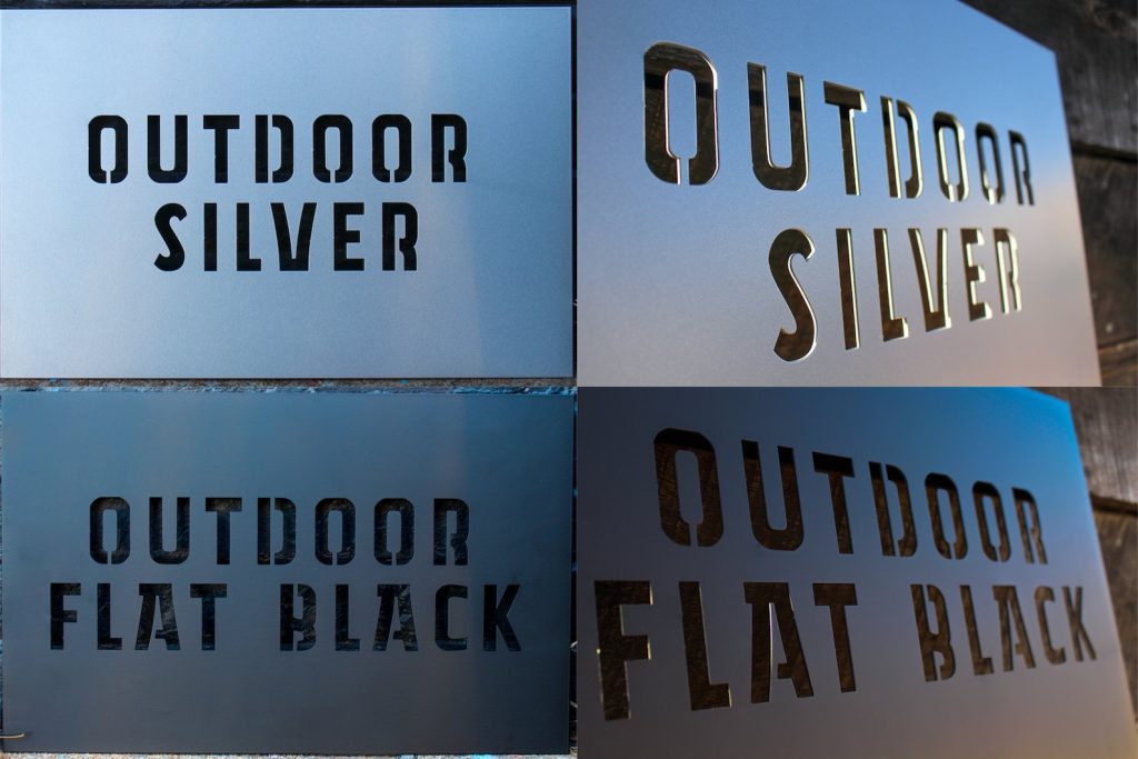 OUTDOOR FLAT BLACK – The Outdoor Flat Black finish is a matte black powder coat. This UV protected finish will protect the steel in the toughest conditions including outside in wet and salty environments. Powder coat is a thick industrial coating that is VOC free and holds up for many years.