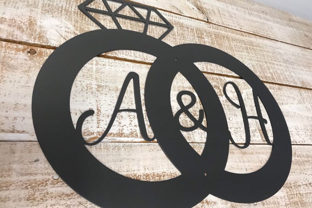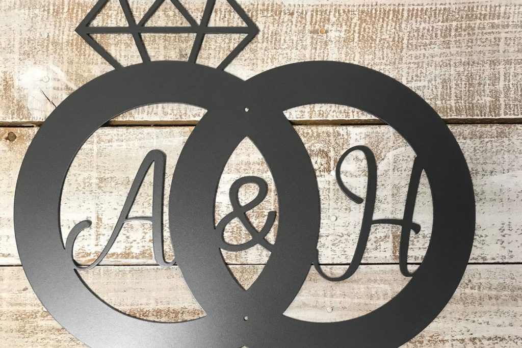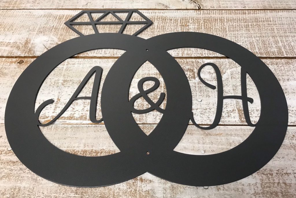 This beautiful customizable wedding ring metal sign is perfect for any new couple.