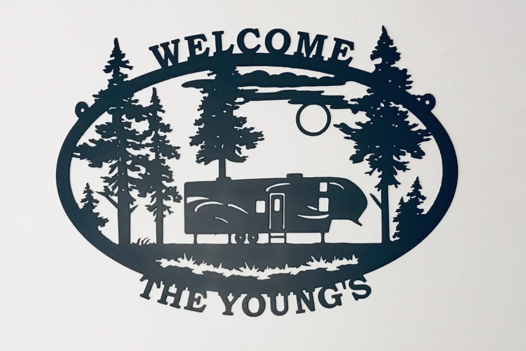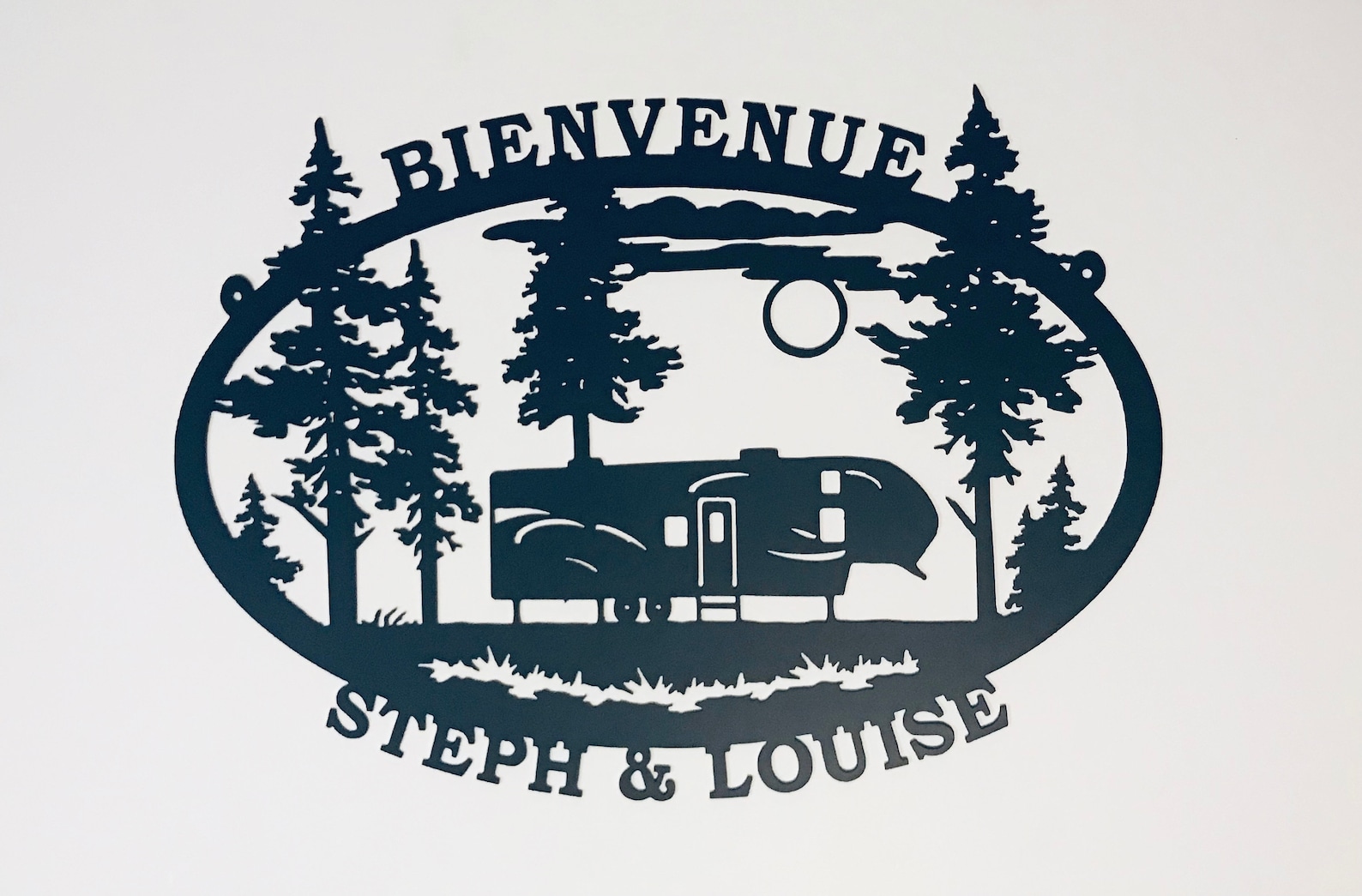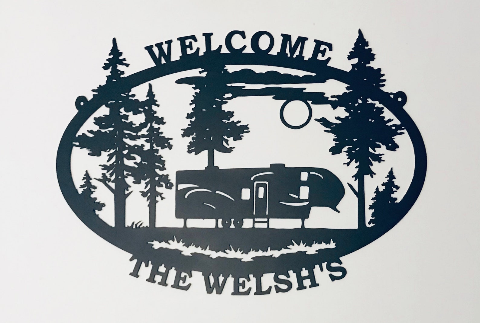 Welcome or Bienvenue personalized fifth wheel camper sign for inside or outside use. Great for campground or home. 16 gauge steel, powder coated black. Can be hung flat on a wall or from chain. Signs are individually made, not mass produced. Can be made with name up top, welcome on bottom OR welcome up top, name on bottom. There is also a listing on to order this sign not personalized.