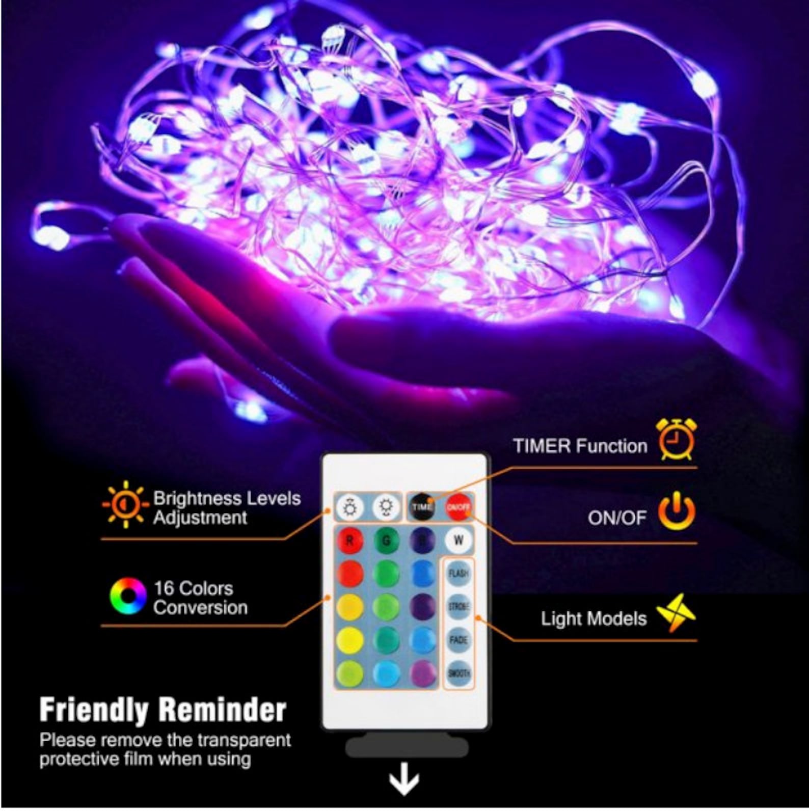 Remote control: You can use the remote to turn the lights on and off, change the color to one of 16 vibrant colors, adjust brightness, cycle through the colors and set a timer.