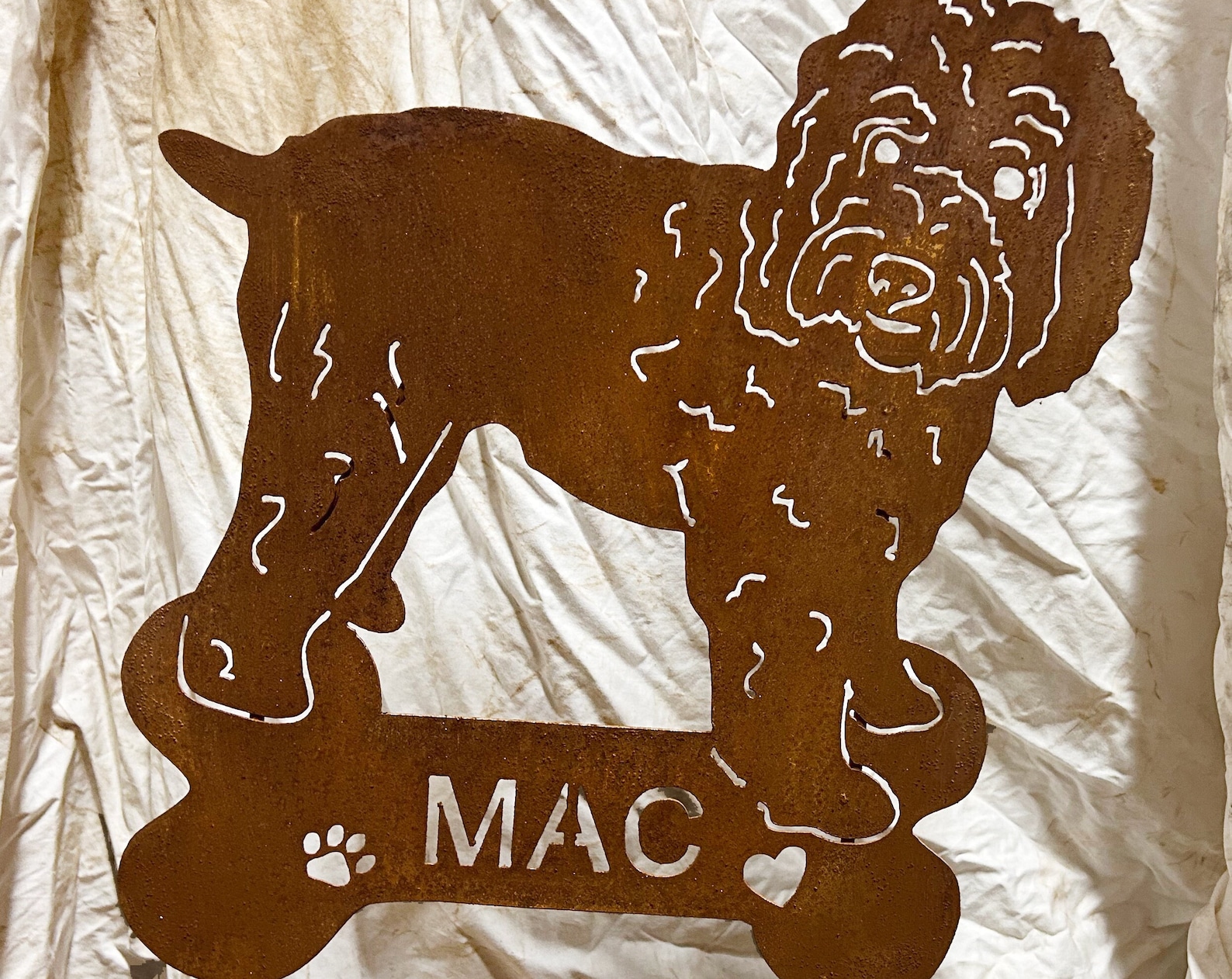 The rust powder coat option a great option for those who like the look of rust but without possible staining or the affects of real rust. The rust powder coat option is a great choice if you are purchasing the Wheaten Terrier wall hanging or if the pup will be hanging on vinyl or the exterior of home or white fence.